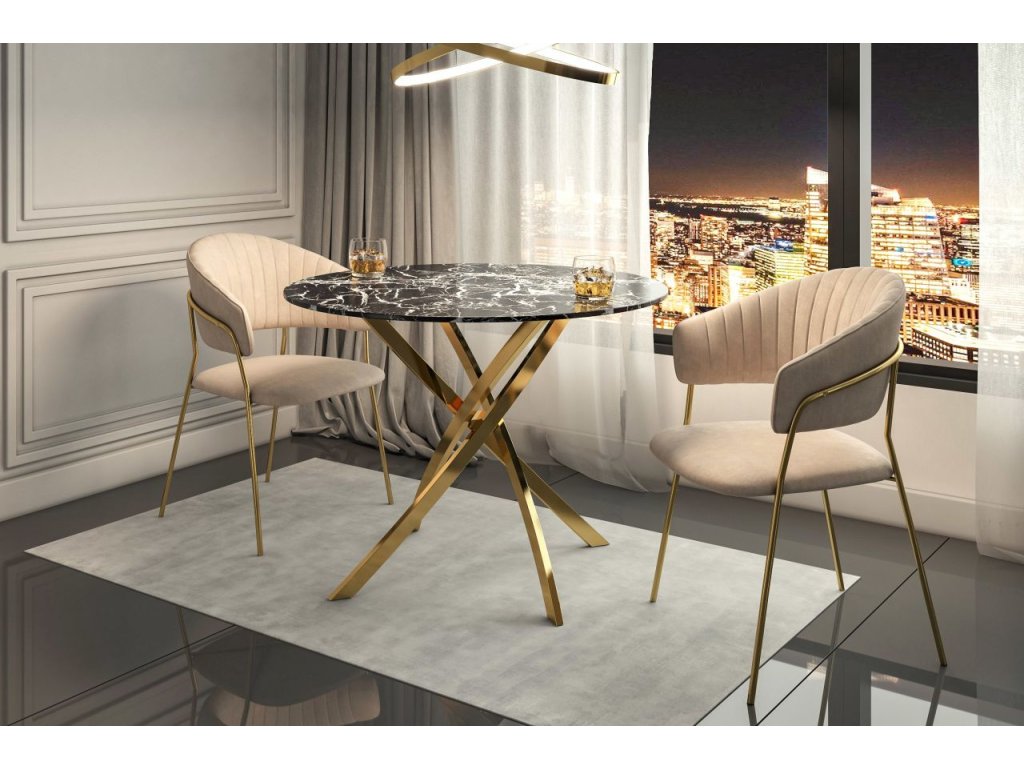 Tento luxusný okrúhly jedálenský stôl v atraktívnej kombinácii čierneho mramorového efektu a zlatých kovových nôh je dokonalým doplnkom pre moderné, glamour a elegantné interiéry. Vďaka svojmu výraznému dizajnu sa stane dominantou jedálne či kuchyne a dodá priestoru nádych luxusu a exkluzivity.