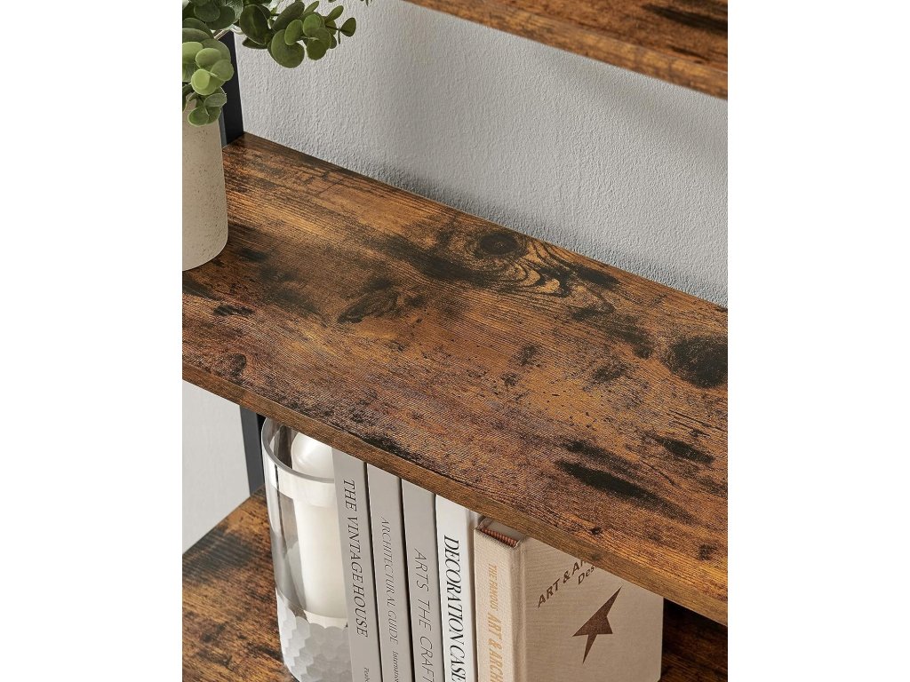Polička je vyrobená v rustikálnom štýle, teda vhodne štylizovaná, aby pôsobila staro. Poličky knižnice sú stabilné, takže na ne môžeme umiestniť knihy, kvety vo vázach, dekoračné figúrky, detské hračky a rámiky na fotografie.