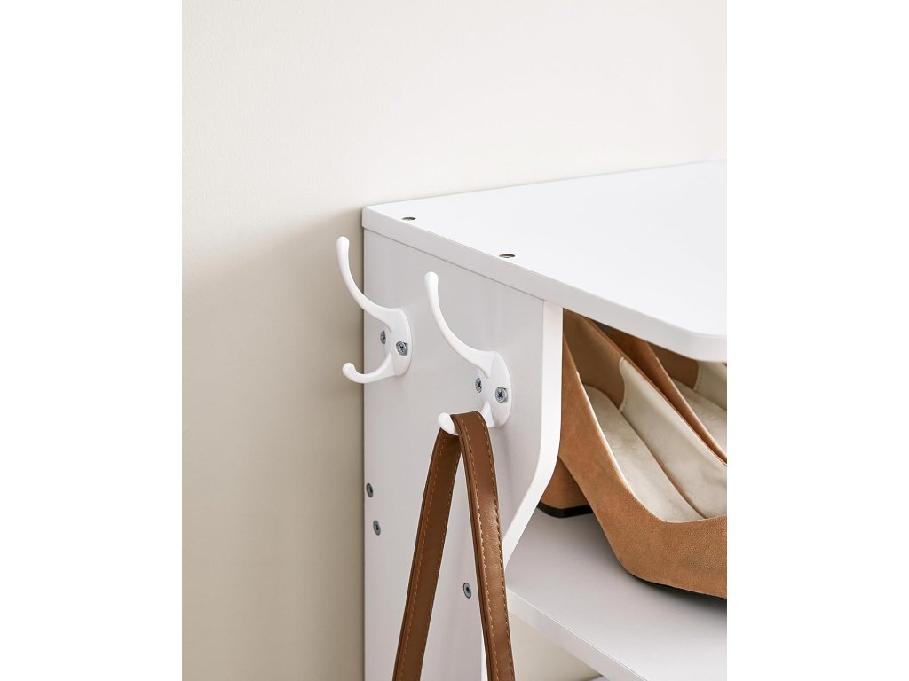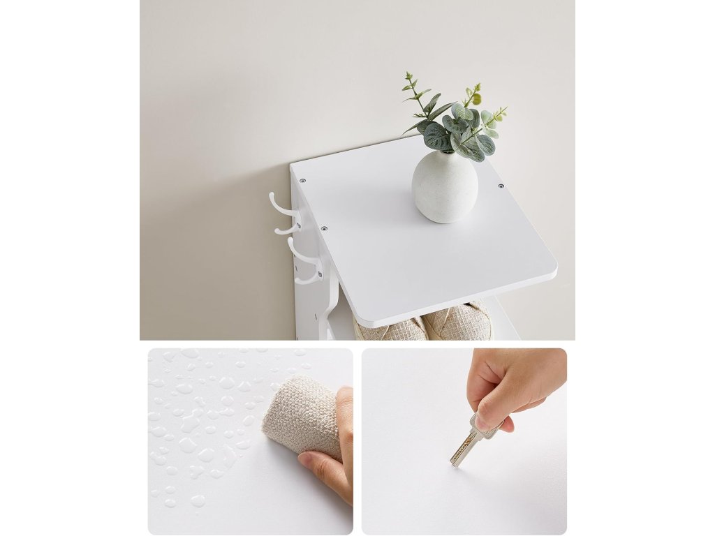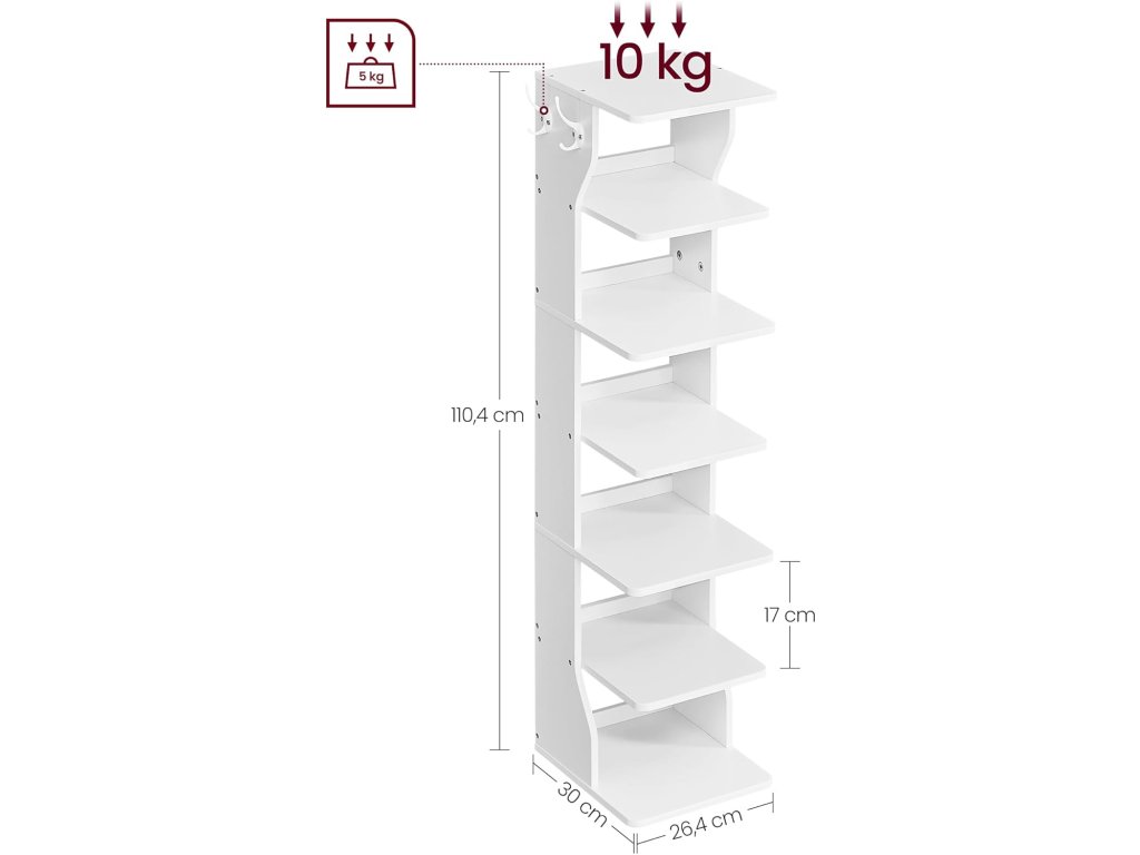 Regál ponúka šesť priestranných políc, ktoré sú ideálne na uloženie športovej obuvi, lodičiek, členkových topánok, papúč, sandálov či drobných doplnkov. Dva praktické bočné háčiky poskytujú dodatočný úložný priestor na kabelky, tašky, šály, opasky alebo kľúče, vďaka čomu budete mať všetko potrebné vždy po ruke.