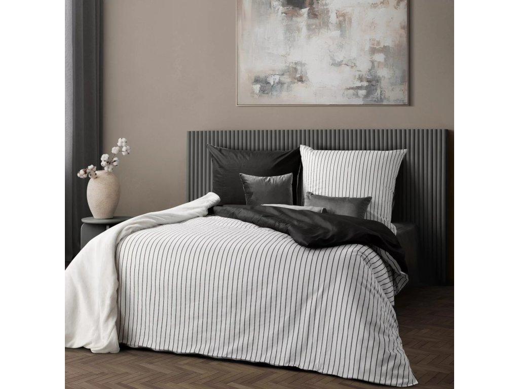 Prúžky vyniknú s jednofarebným prehozom alebo dekoračnými vankúšmi v hladkej textúre; pre moderný „mix & match“ efekt skombinujte s ďalšou súpravou z rovnakej kolekcie.