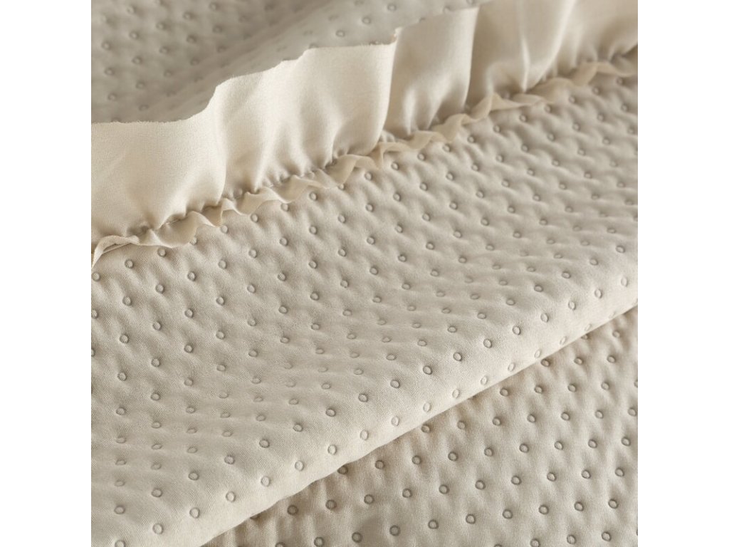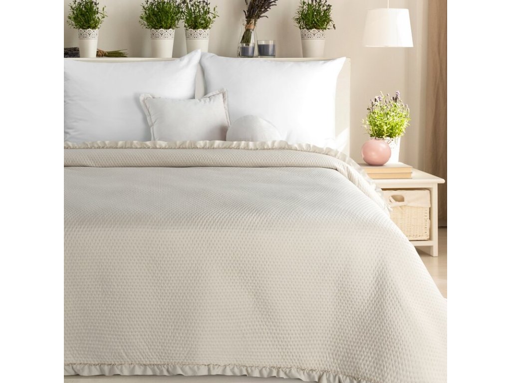 Elegantný béžový prehoz na posteľ s dekoratívnou volánovou lemovkou dokonale dopĺňa každý interiér spálne.