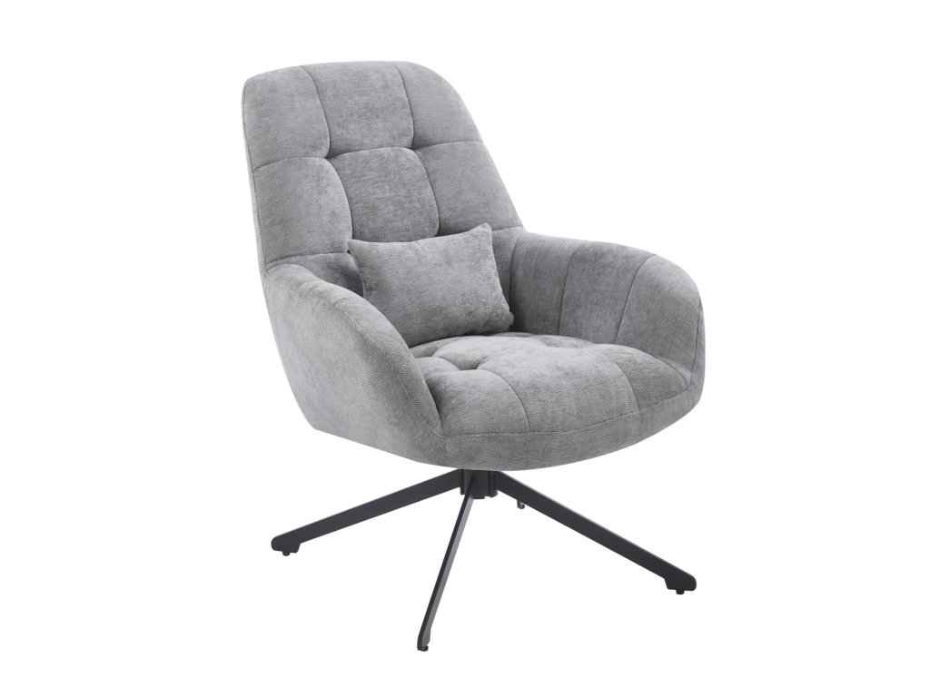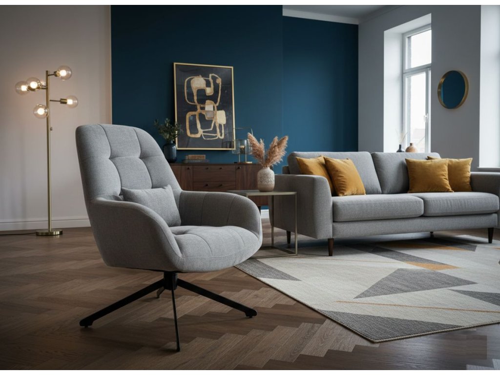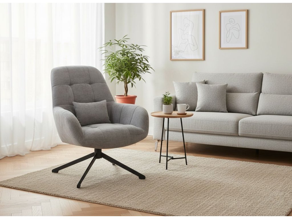 Doprajte si komfortný oddych v kresle, ktoré spája nadčasový dizajn a praktickú funkčnosť. Relaxačné kreslo s otočným sedadlom v rozsahu 360° vám umožní plynulo sa otočiť presne tam, kam potrebujete – pri čítaní, rozhovore aj relaxe po náročnom dni. Sivé čalúnenie z tkaniny Holms pôsobí elegantne a ľahko sa kombinuje s drevom, kameňom aj kovovými detailmi. Stabilná čierna kovová konštrukcia s práškovou povrchovou úpravou dodáva kreslu moderný charakter a vizuálnu ľahkosť.
