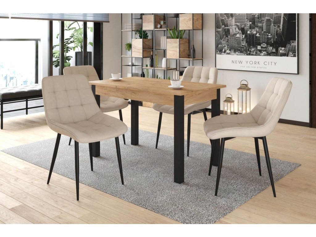 Moderný vzhľad tvorí kombinácia dekoru dub zlatý craft a čiernych nôh, ktorá sa hodí do industriálnych, moderných aj škandinávskych interiérov. Stolová doska je vyrobená z laminovanej dosky – praktickej na údržbu a vhodnej na každodenné používanie. Hrany sú spevnené ABS páskou, ktorá chráni okraje pred poškodením a zvyšuje odolnosť. Stabilitu zabezpečujú pevné nohy z MDF v čiernej farbe.