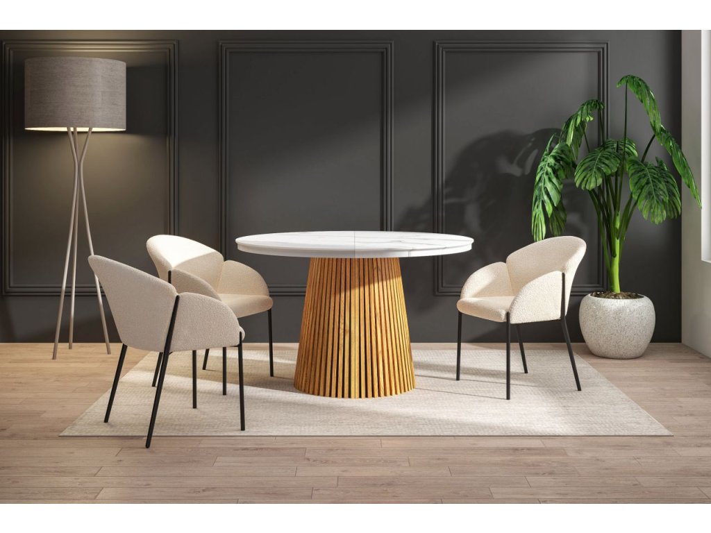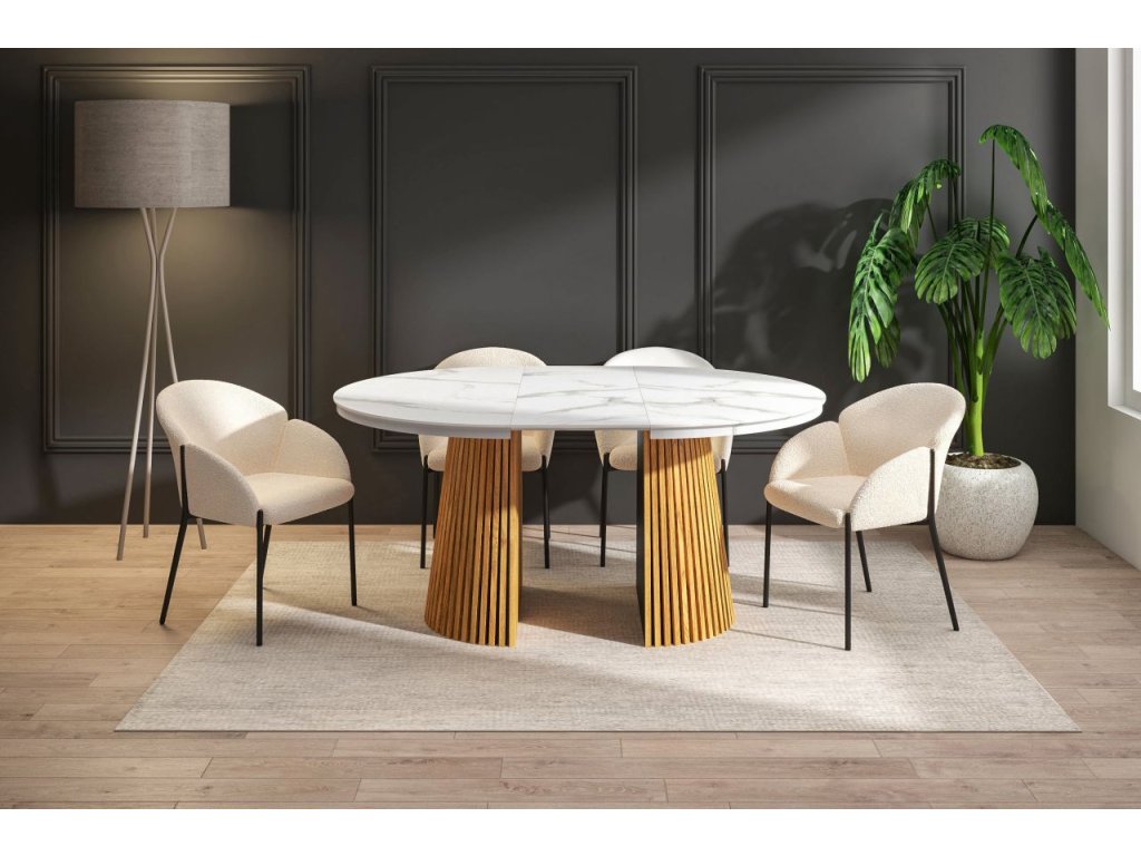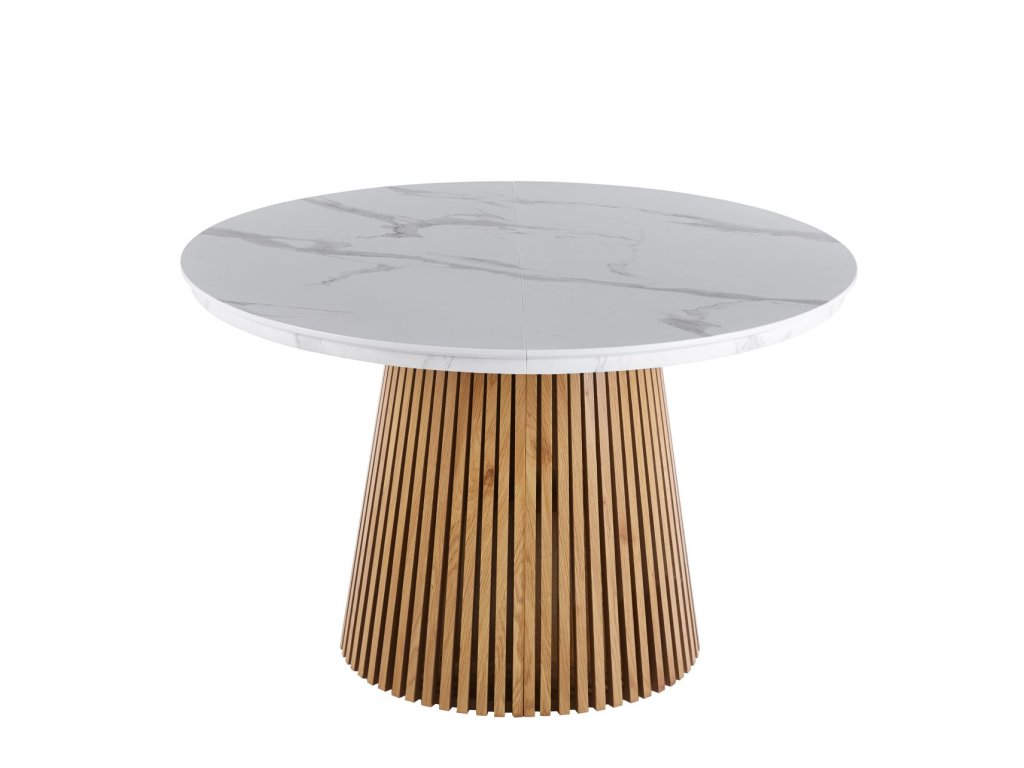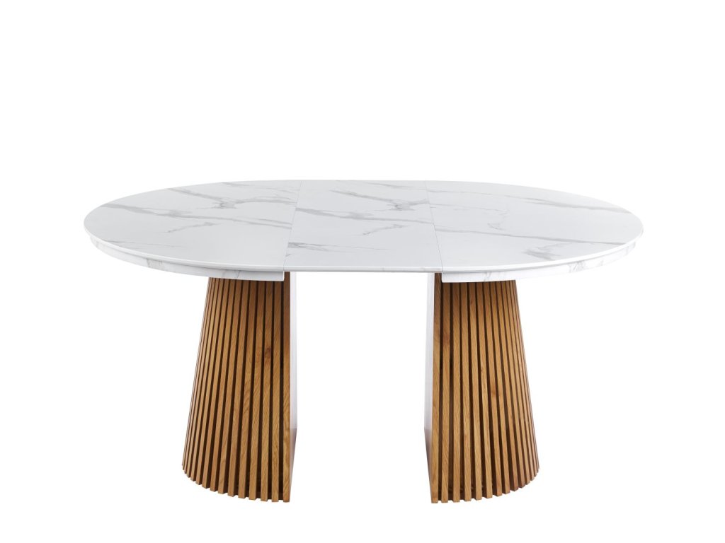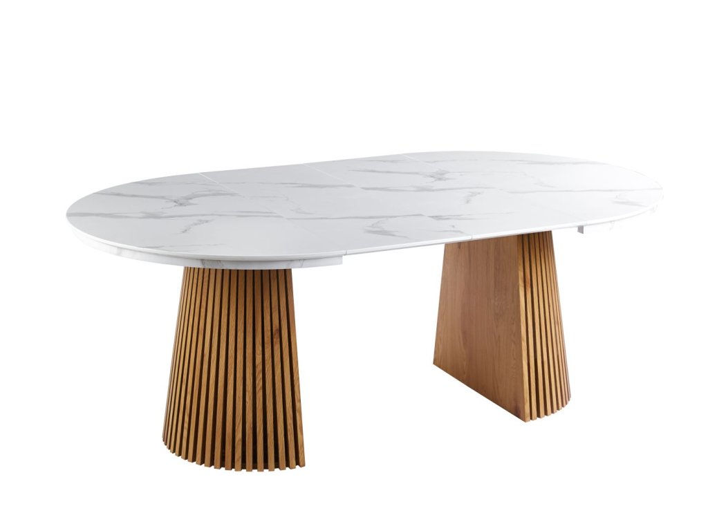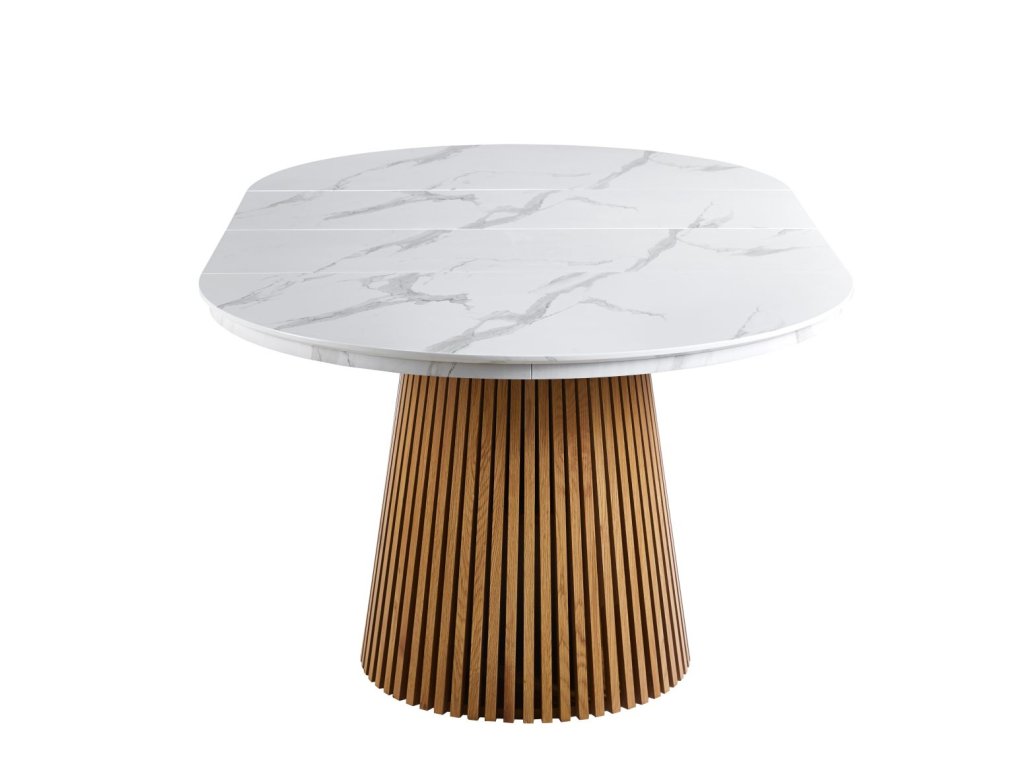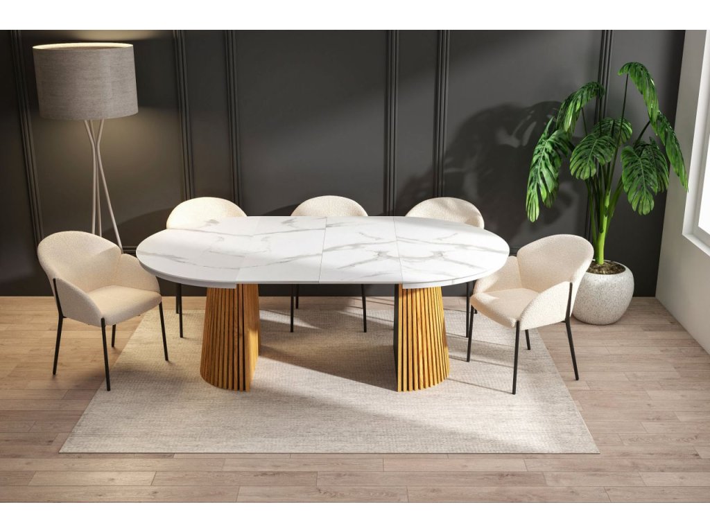 Rozkladací jedálenský stôl MARBELLO FLEX je dokonalým spojením moderného dizajnu, funkčnosti a nadčasovej elegancie. Luxusný vzhľad bieleho mramoru v kombinácii s teplým dekórom dubového dreva vytvára harmonický kontrast, ktorý vynikne v moderných, škandinávskych aj elegantných interiéroch.