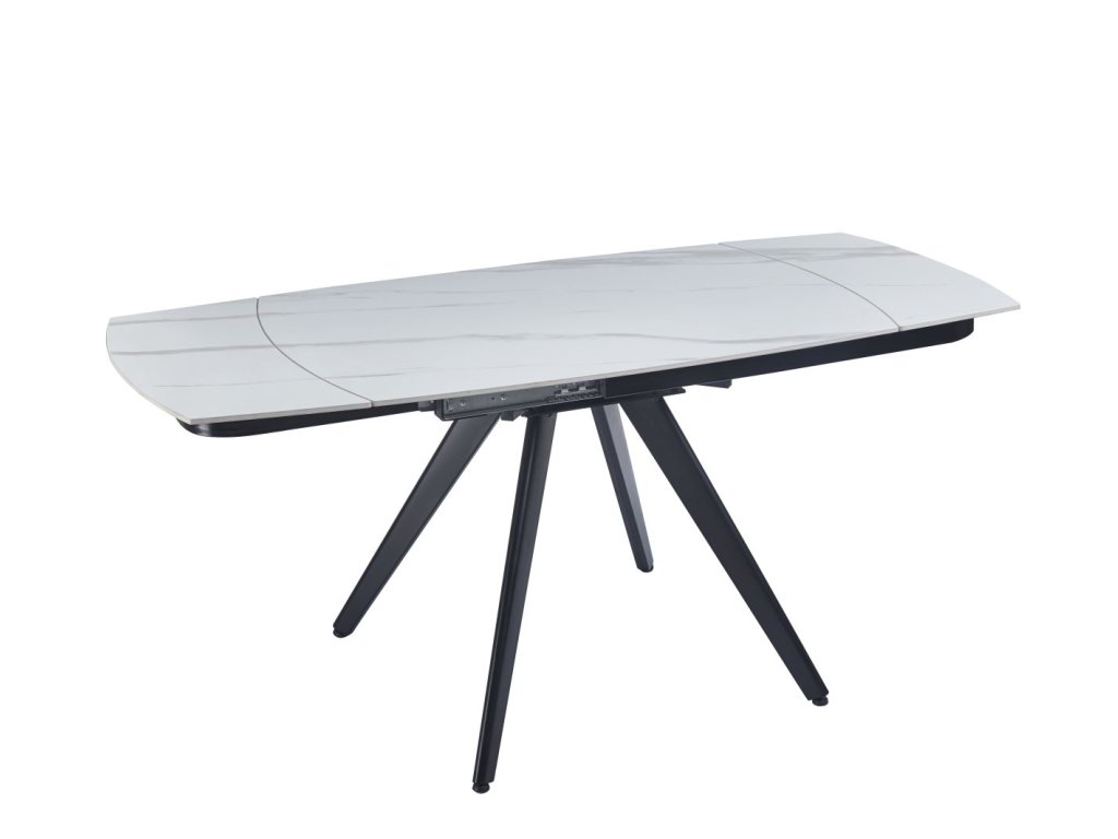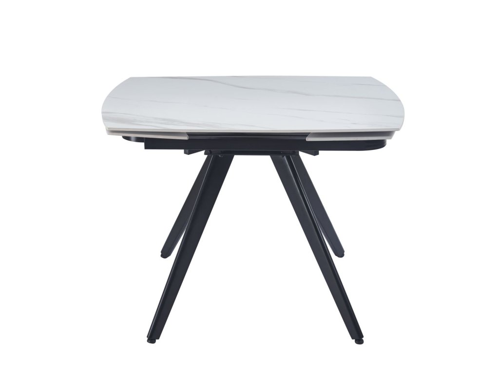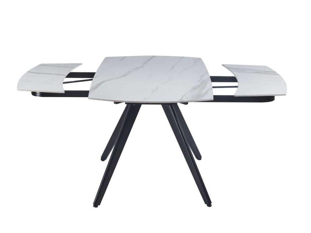 Rozkladací jedálenský stôl s elegantnou keramickou doskou v dekore bieleho mramoru je ideálnym riešením pre moderné jedálne a kuchyne. Kombinácia luxusného vzhľadu mramoru s praktickým rozkladacím mechanizmom vytvára nábytok, ktorý spája štýl s funkčnosťou. Čierne kovové nohy dodávajú stolu moderný kontrast a stabilitu.