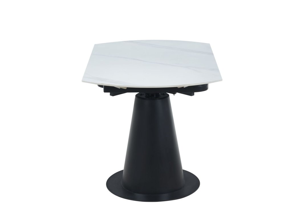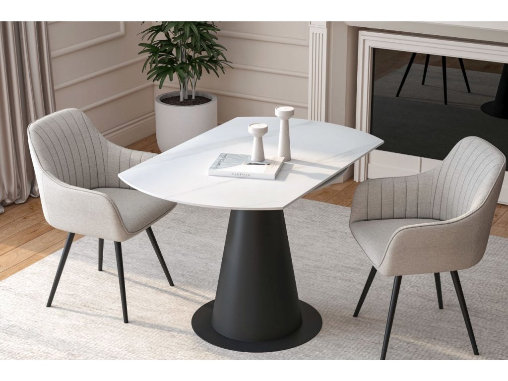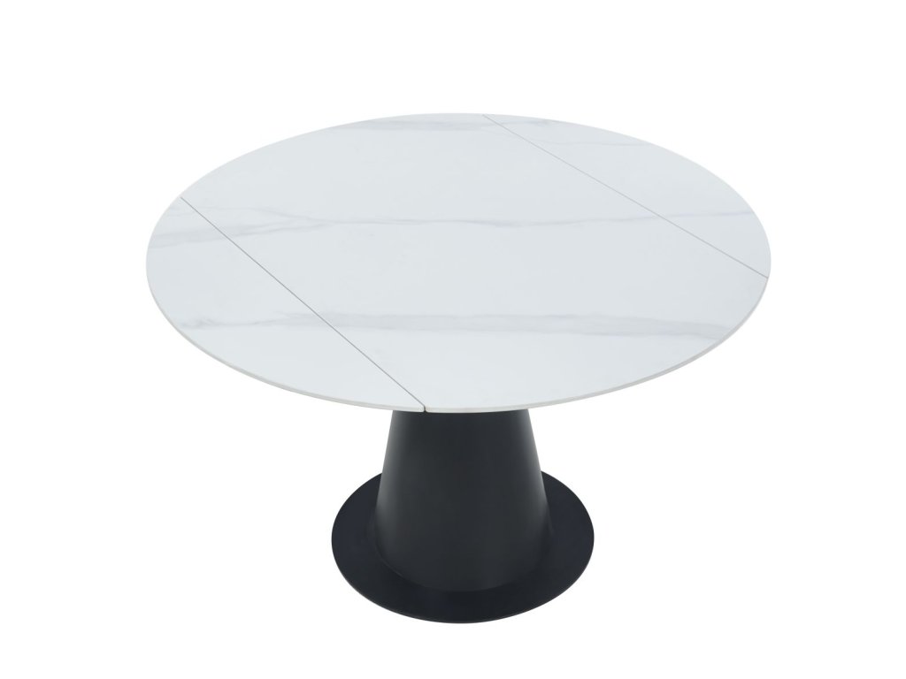 Tento elegantný rozkladací jedálenský stôl s mramorovou doskou predstavuje dokonalú kombináciu luxusného dizajnu a praktickej funkčnosti. Keramická doska v dekore bieleho mramoru vytvára noblesný vzhľad, ktorý dodá každej jedálni či kuchyni moderný luxusný charakter. Čierna kovová konštrukcia s práškovým lakovaním zabezpečuje vysokú odolnosť a stabilitu.