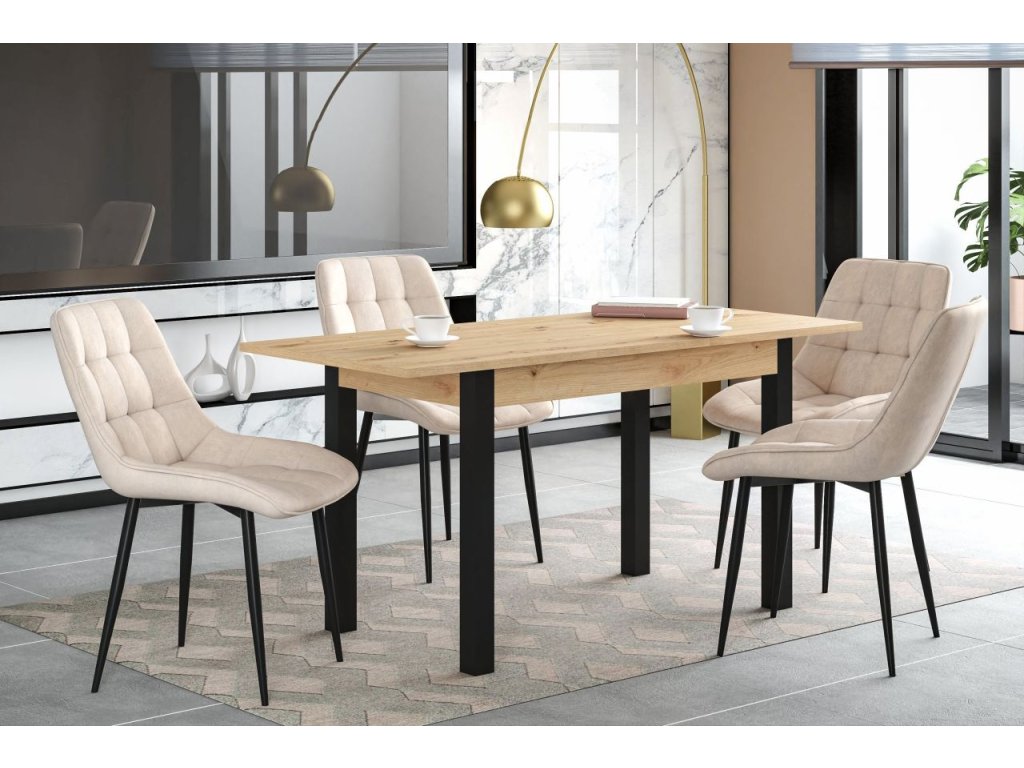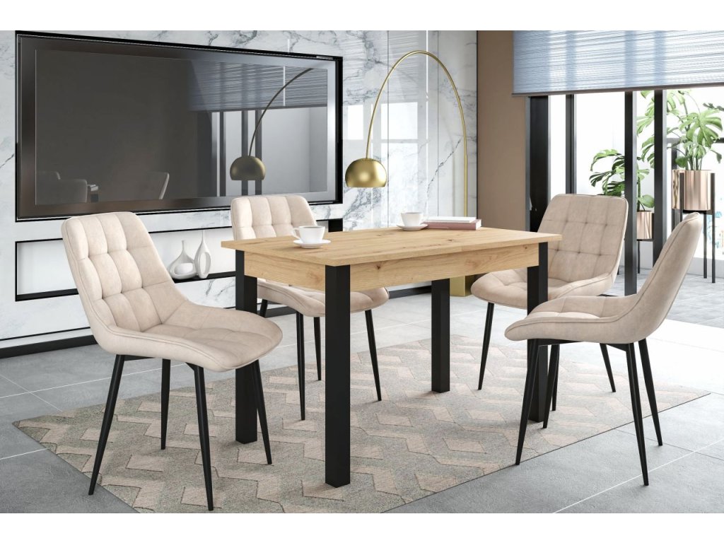 Rozkladací jedálenský stôl s elegantnou kombináciou dekoru dub artisan a čiernej farby je ideálnym riešením pre moderné jedálne. Laminovaná doska s ABS hranami zabezpečuje odolnosť a jednoduché čistenie, zatiaľ čo prírodný vzhľad dubového dekoru dodáva interiéru teplo a eleganciu.