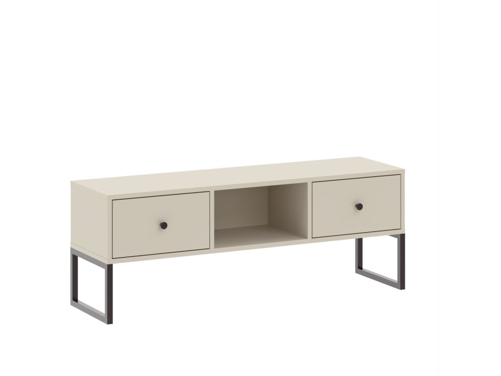 Moderný RTV stolík v štýlovej kašmírovej farbe je ideálnym riešením pre organizáciu elektroniky v obývačke. Vďaka dvom praktickým zásuvkám s kuličkovými vodítkami ponúka dostatok úložného priestoru pre diaľkové ovládače, káble a ďalšie príslušenstvo. Čierne kovové úchytky a nohy vytvárajú elegantný kontrast a dodávajú nábytku moderný vzhľad.