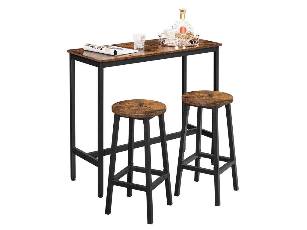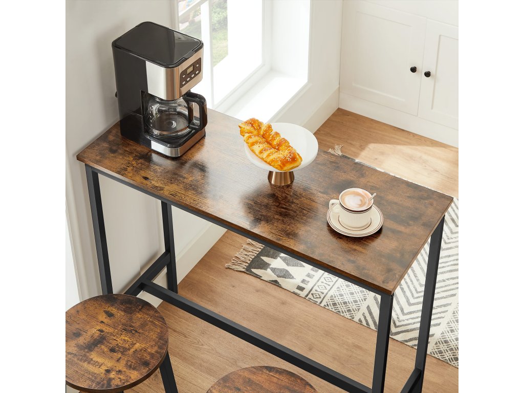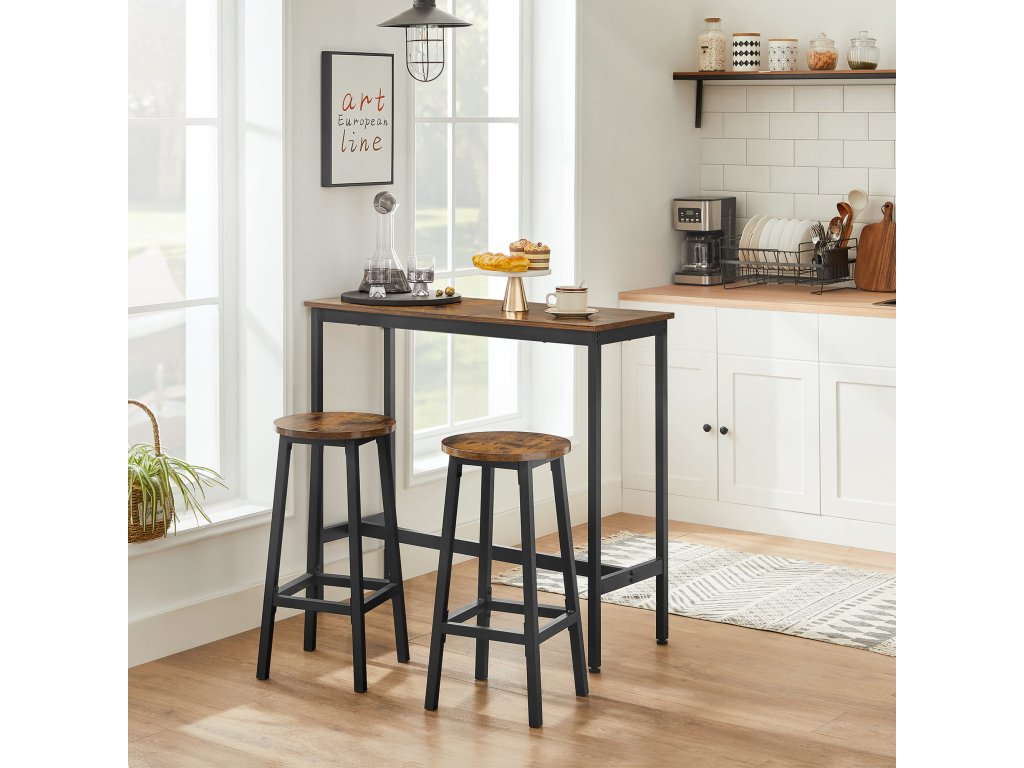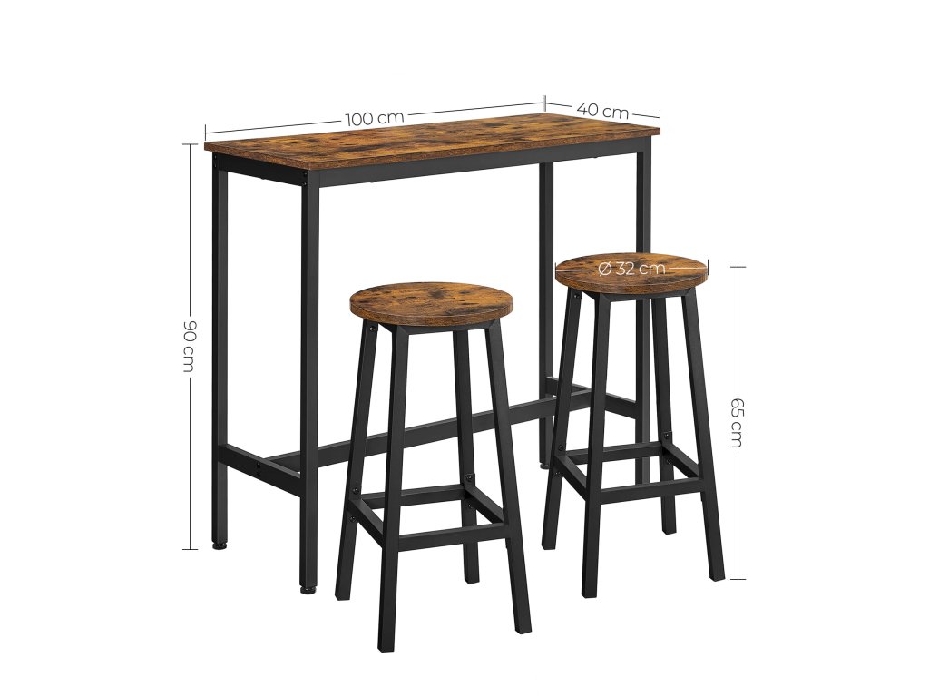 Barový stôl poskytuje dostatok priestoru na každodenné stolovanie, rýchle raňajky alebo neformálne posedenie. Dve barové stoličky je možné pohodlne zasunúť pod stôl, čím šetríte miesto a zachovávate čistý, usporiadaný priestor. Stabilná konštrukcia z ocele a kvalitná drevotriesková doska zabezpečujú dlhú životnosť a pevnosť pri každodennom používaní.