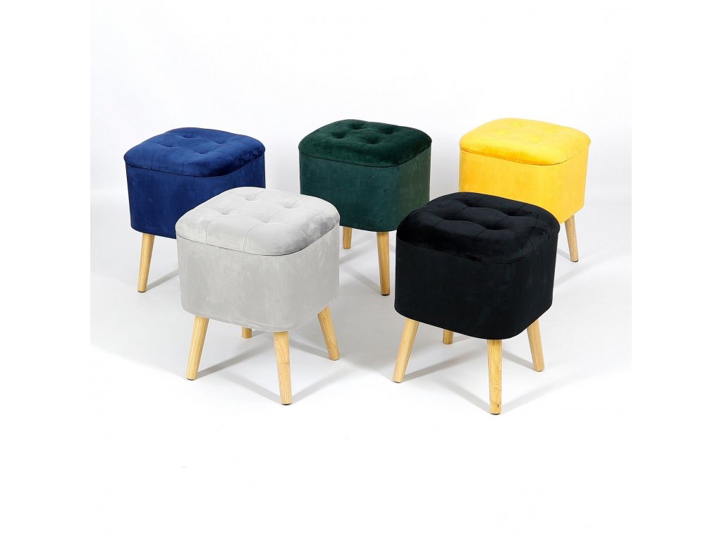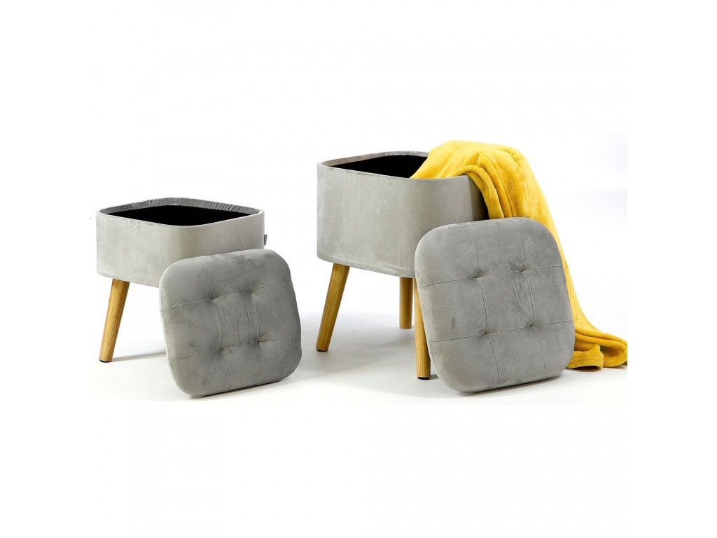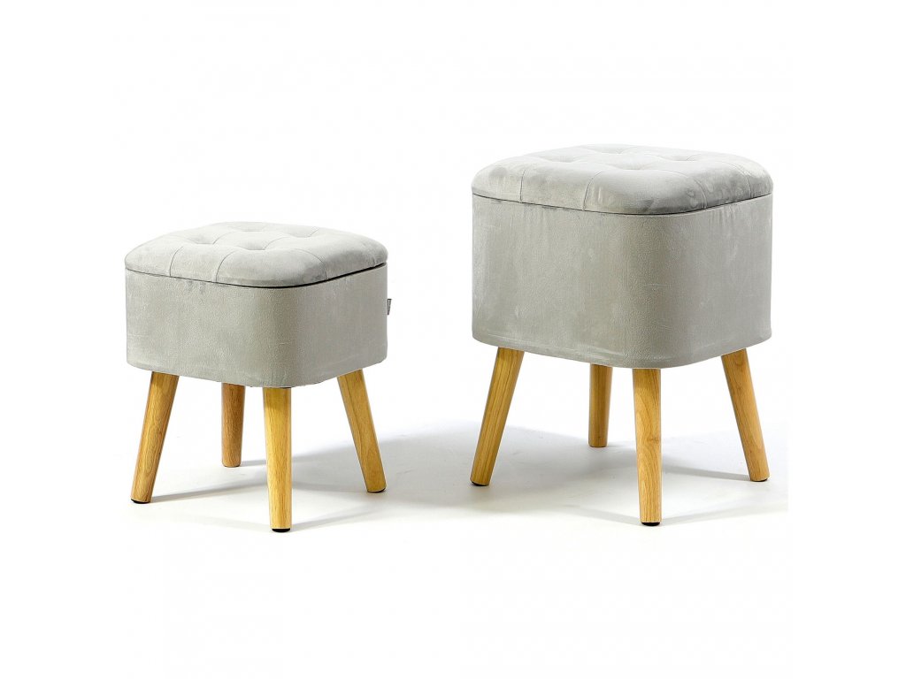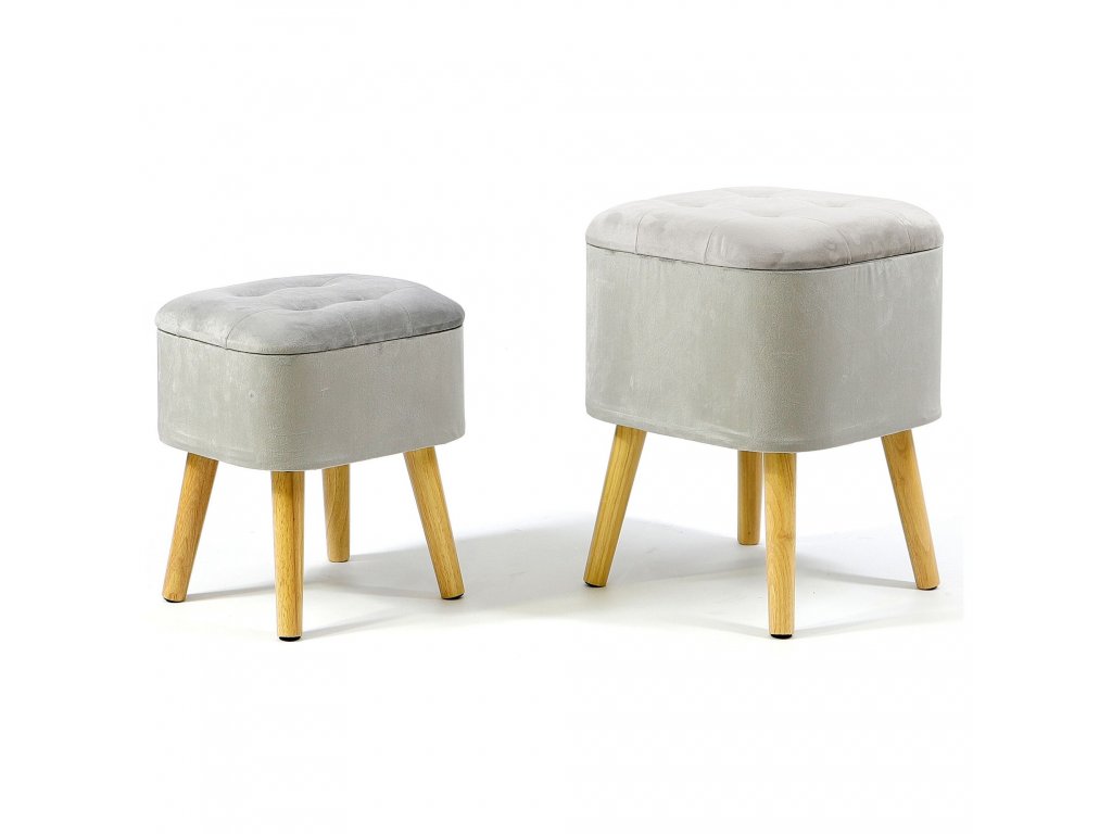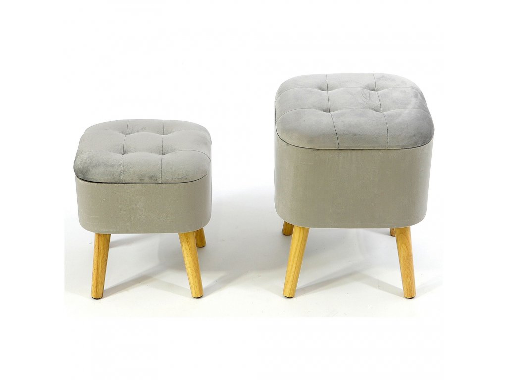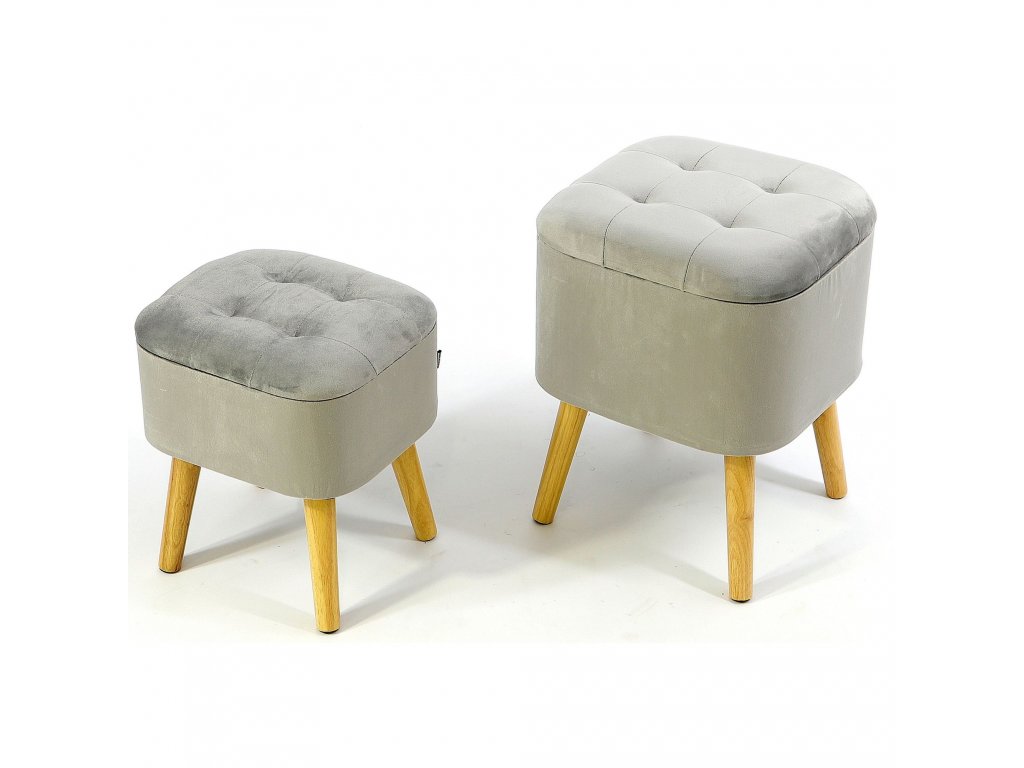 Vďaka dreveným rovným nožičkám a jednoduchej forme však dobre poslúži aj ako doplnok do miestností zariadených v BOHO tónoch. Prezentované taburetky sú vyrobené zo svetlo sivého velúru, prešívaný na vrchu, veľmi príjemný na dotyk.