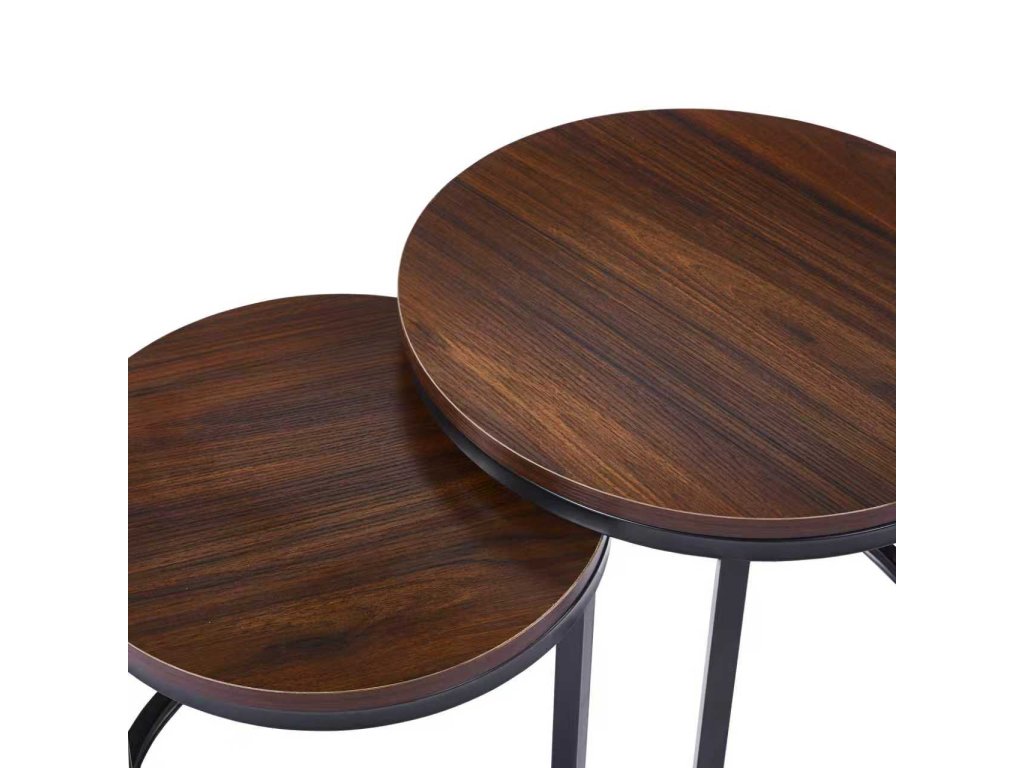 Dosky stolíkov sú vyrobené z MDF s kvalitnou imitáciou orechového dreva, ktorá dodáva interiéru teplý a prírodný vzhľad. Čierne oceľové nohy s práškovou úpravou zabezpečujú stabilitu a zároveň vytvárajú atraktívny kontrast s dreveným dekórom. Rôzne výšky stolíkov umožňujú ich praktické zasunutie alebo samostatné použitie.