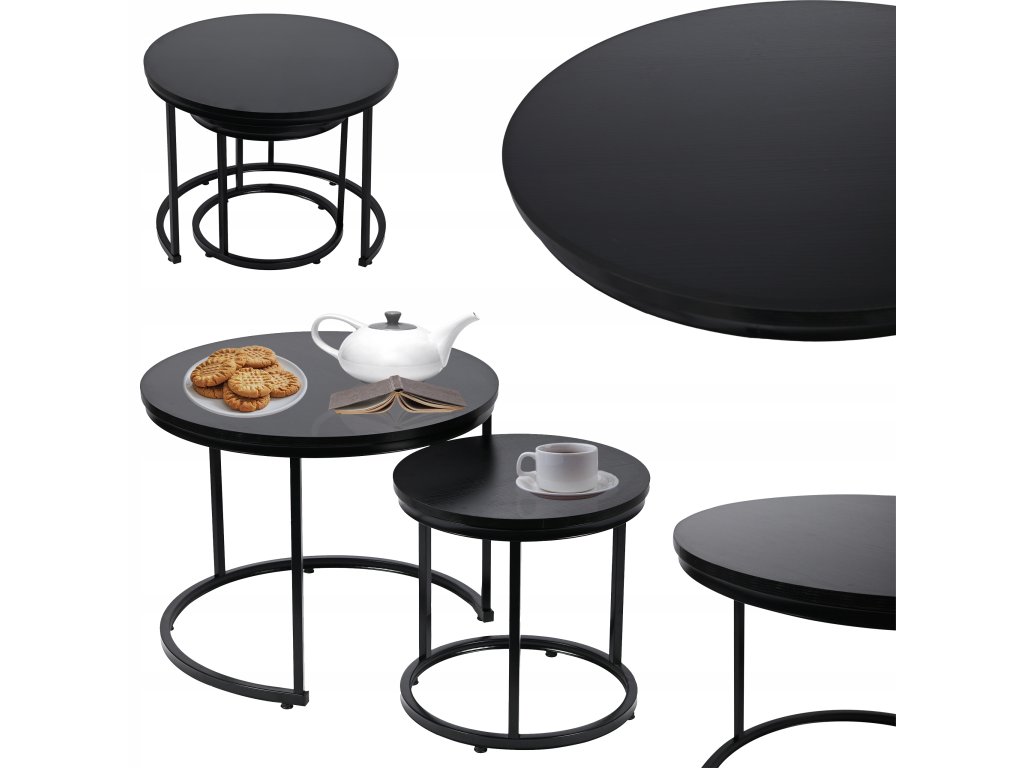 Stolíky sú vyrobené z kvalitnej MDF dosky v čiernej farbe, ktorá pôsobí elegantne a moderne. Stabilitu a dlhú životnosť zabezpečuje kovová konštrukcia s práškovým lakovaním, odolná voči bežnému opotrebovaniu. Vďaka univerzálnemu dizajnu sa set hodí nielen do obývačky, ale aj do kancelárie, pracovne či moderného apartmánu.