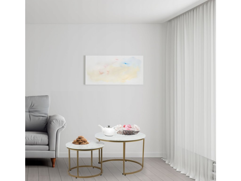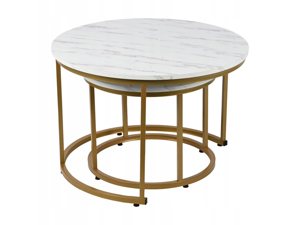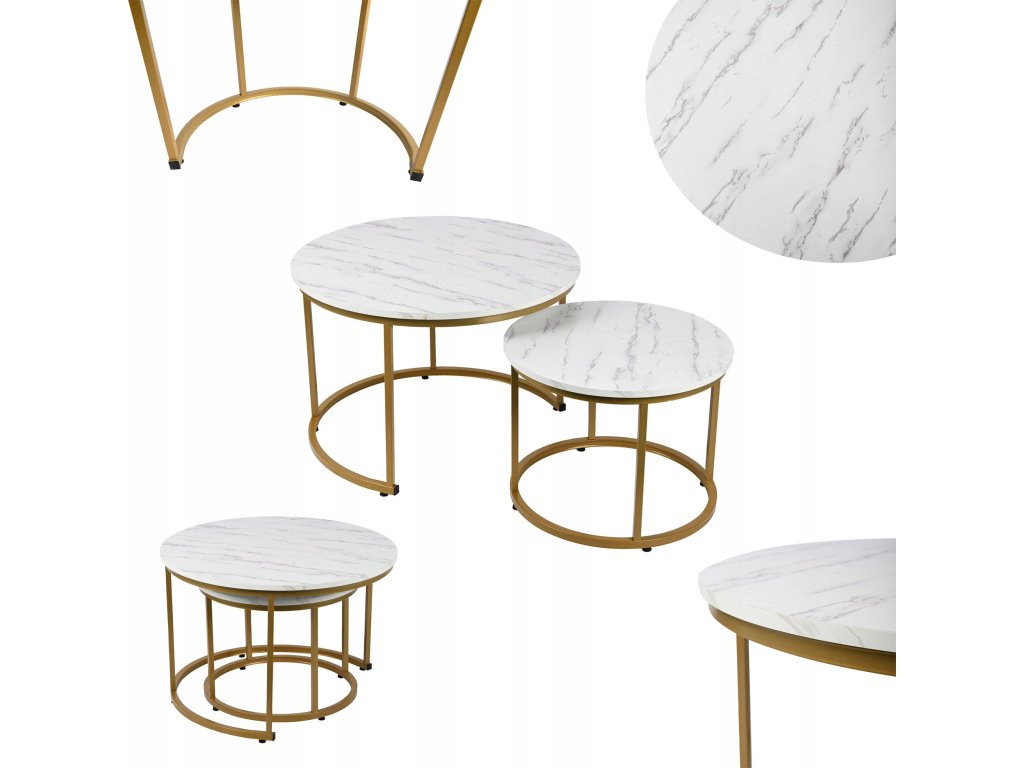 Doprajte svojmu interiéru jemnú eleganciu a moderný dizajn. Tento set dvoch konferenčných stolíkov spája drevotrieskovú dosku s povrchom v imitácii bieleho mramoru a stabilné kovové nohy v zlatej úprave, ktoré pôsobia luxusne a nadčasovo.