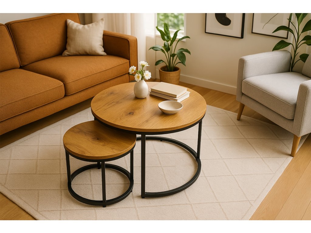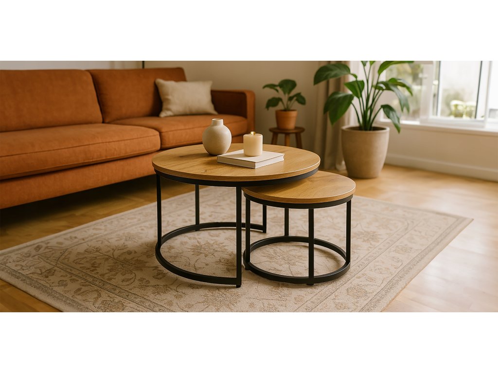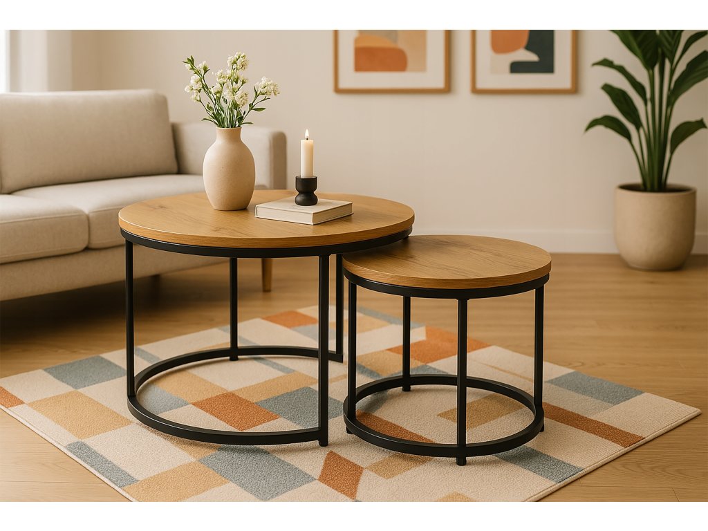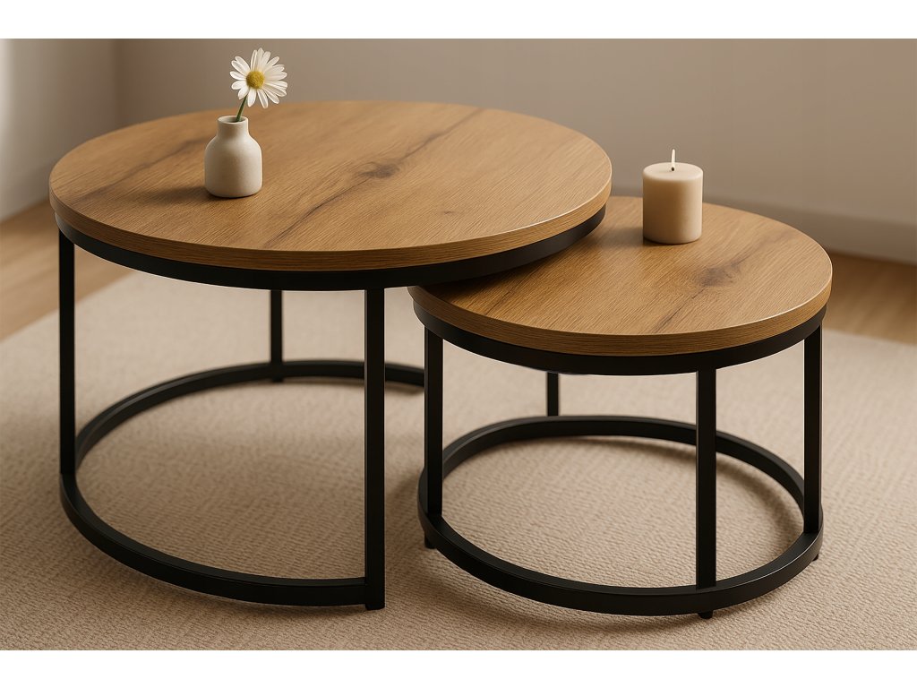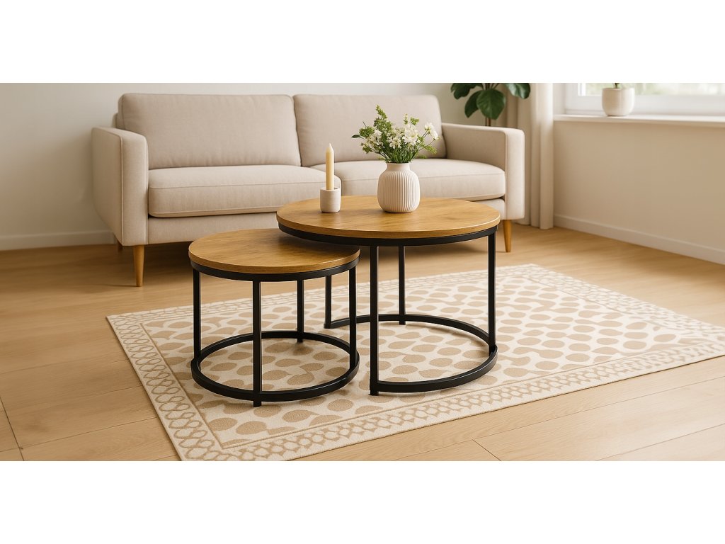 Spojenie prírodného vzhľadu a moderného dizajnu. Tento set dvoch konferenčných stolíkov kombinuje drevotrieskovú dosku v dekore Dub prírodný s pevnými kovovými nohami v čiernej matnej úprave. Výsledkom je nadčasový kúsok, ktorý skvele zapadne do každého interiéru.