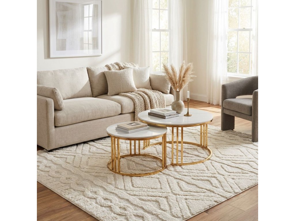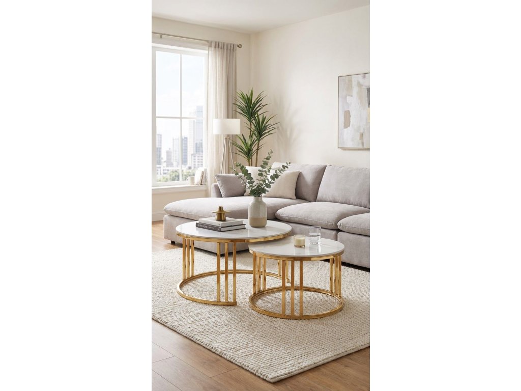 Set dvoch kávových stolíkov v dekore bieleho mramoru je presne ten detail, ktorý dodá obývačke ľahkosť a šperkovo pôsobiaci akcent. Keramická doska s mramorovým efektom vyzerá elegantne a pritom zostáva praktická na každodenné používanie. Zlatá lesklá konštrukcia vytvára sofistikovaný kontrast a zvýrazní čisté línie celého setu.