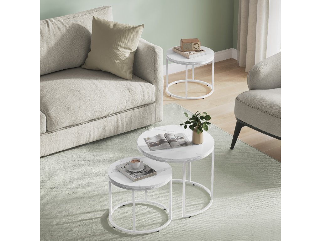 Dopraj svojmu interiéru dokonalú harmóniu štýlu a funkčnosti s týmto dizajnovým setom dvoch kávových stolíkov v obľúbenom mramorovom štýle. Kombinácia bielej mramorovej dosky a kovových nôh v bielej farbe vytvára moderný, jemný a nadčasový vzhľad, ktorý perfektne doplní obývačku, spálňu či pracovňu.