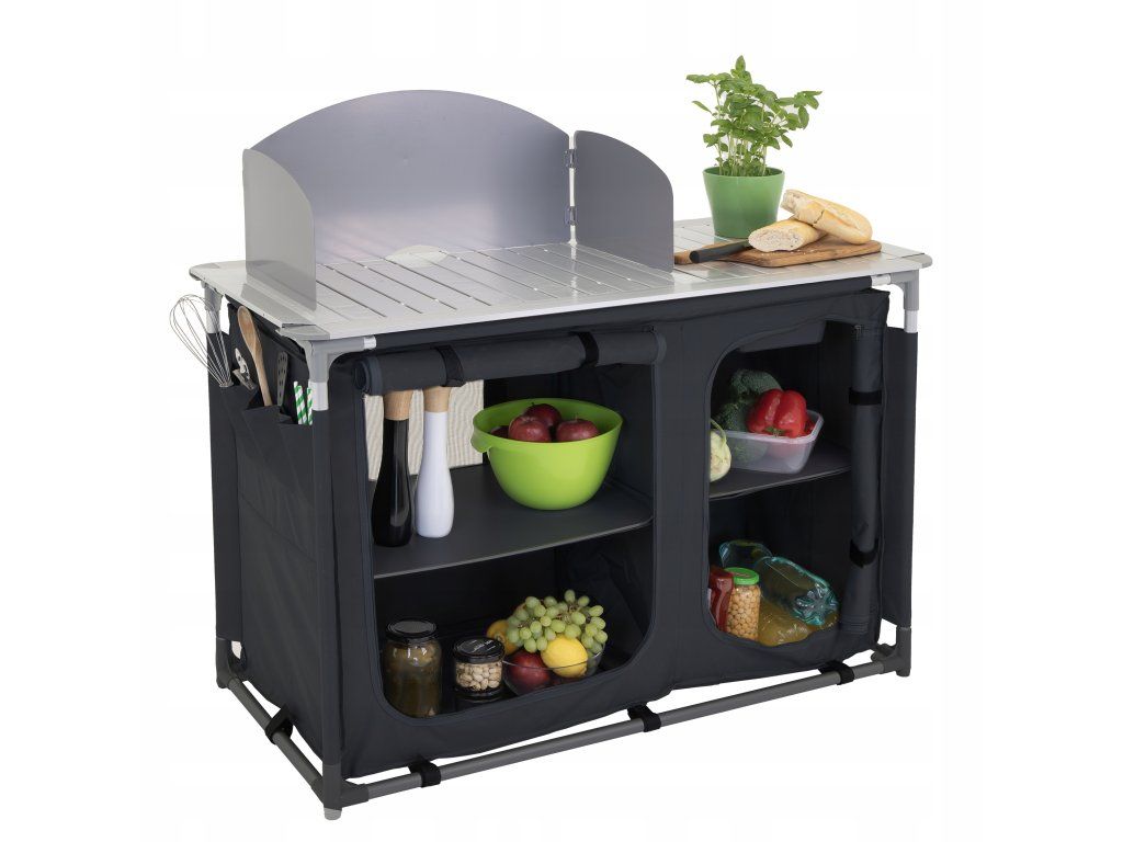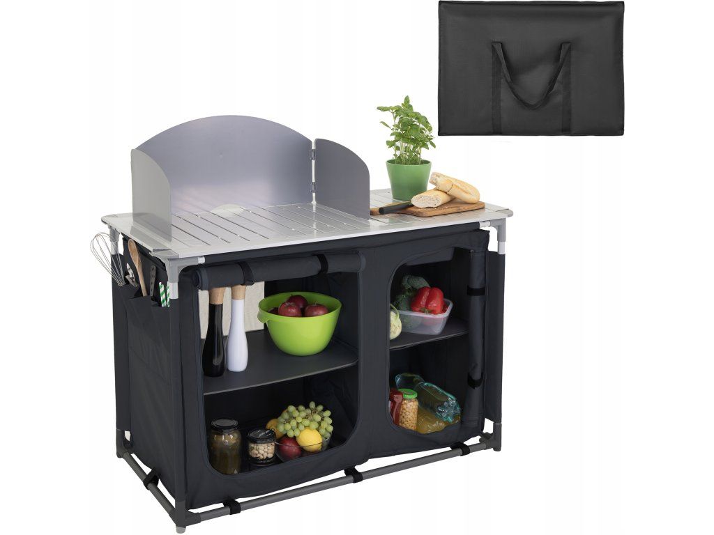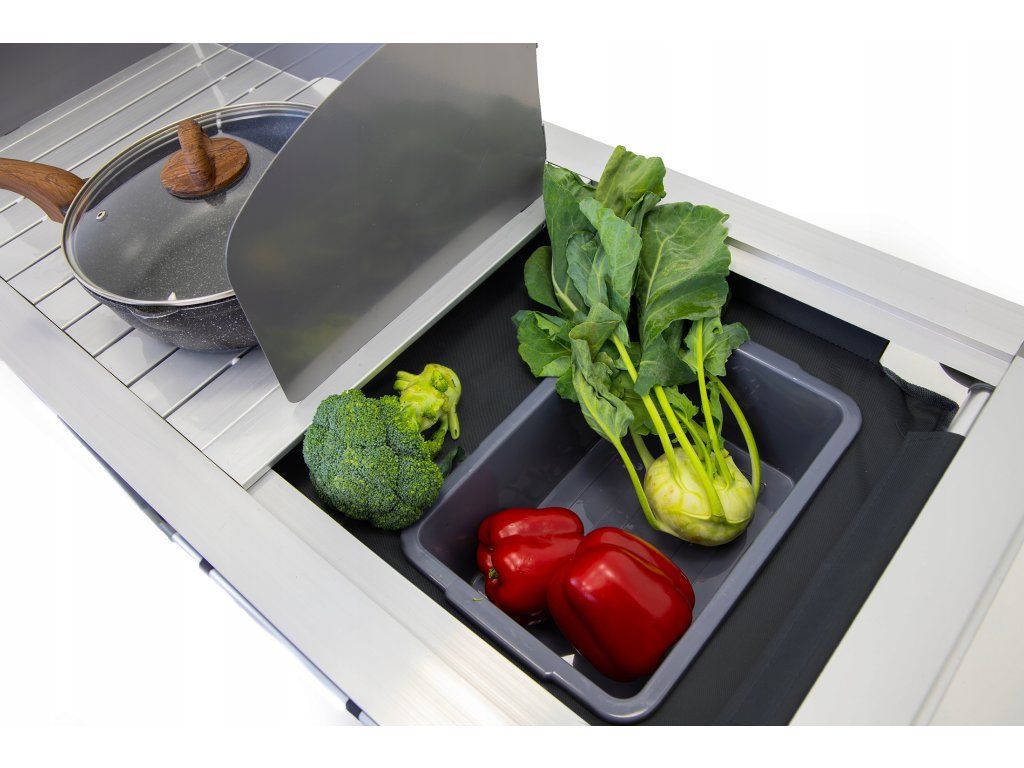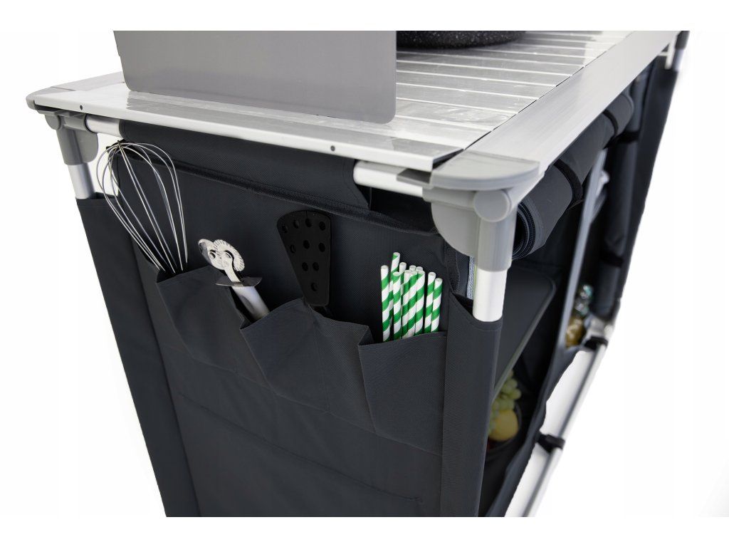 Kovová pracovná doska vydrží každodenné zaťaženie, zrolovaná bočná plocha sa rozloží podľa potreby a praktická vanička pod ňou slúži ako umývadlo. Závesná skrinka so štyrmi spevnenými policami dopĺňa celok o úložný priestor pre potraviny, nádoby aj kempingové doplnky.