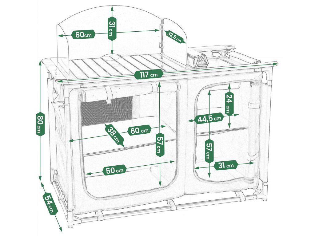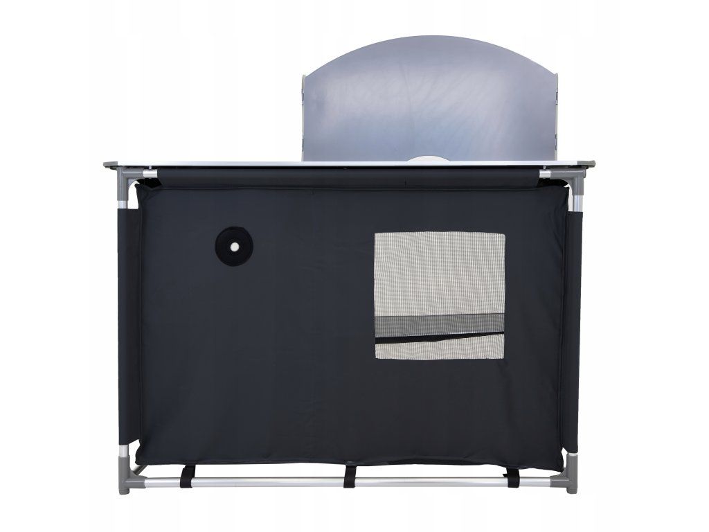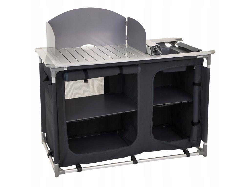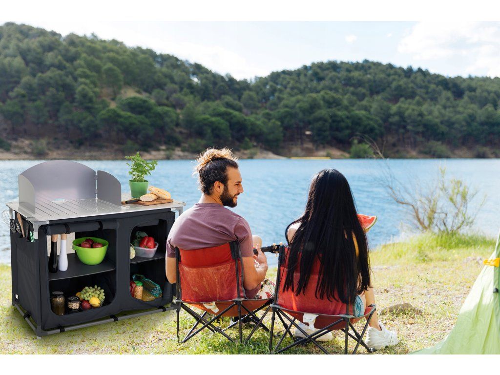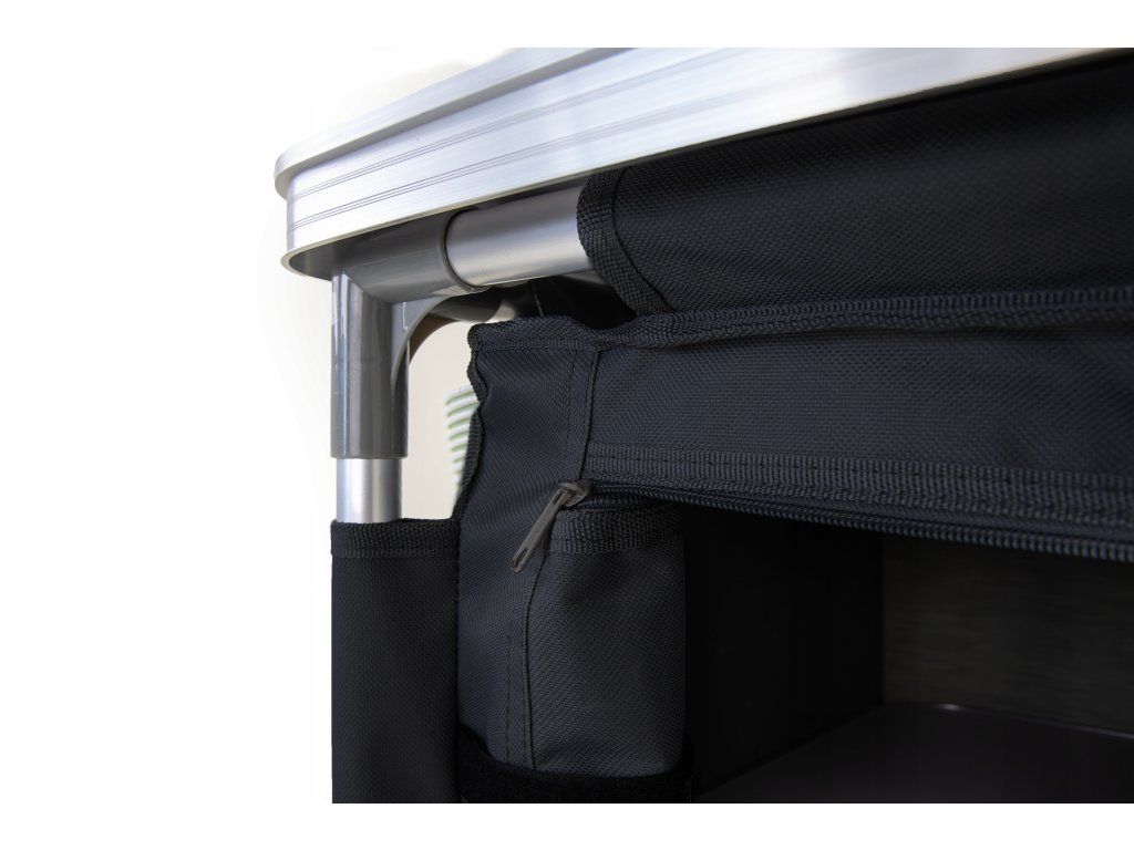Kovová pracovná doska vydrží každodenné zaťaženie, zrolovaná bočná plocha sa rozloží podľa potreby a praktická vanička pod ňou slúži ako umývadlo. Závesná skrinka so štyrmi spevnenými policami dopĺňa celok o úložný priestor pre potraviny, nádoby aj kempingové doplnky.