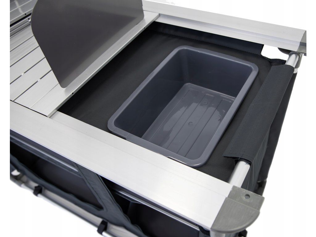 Bočná pracovná plocha sa jednoducho rozroluje vždy, keď potrebujete viac miesta. Priamo pod ňou sa nachádza odnímateľná vanička, ktorú využijete na umývanie riadu – praktické riešenie bez potreby hľadať zdroj vody ďaleko od tábora.