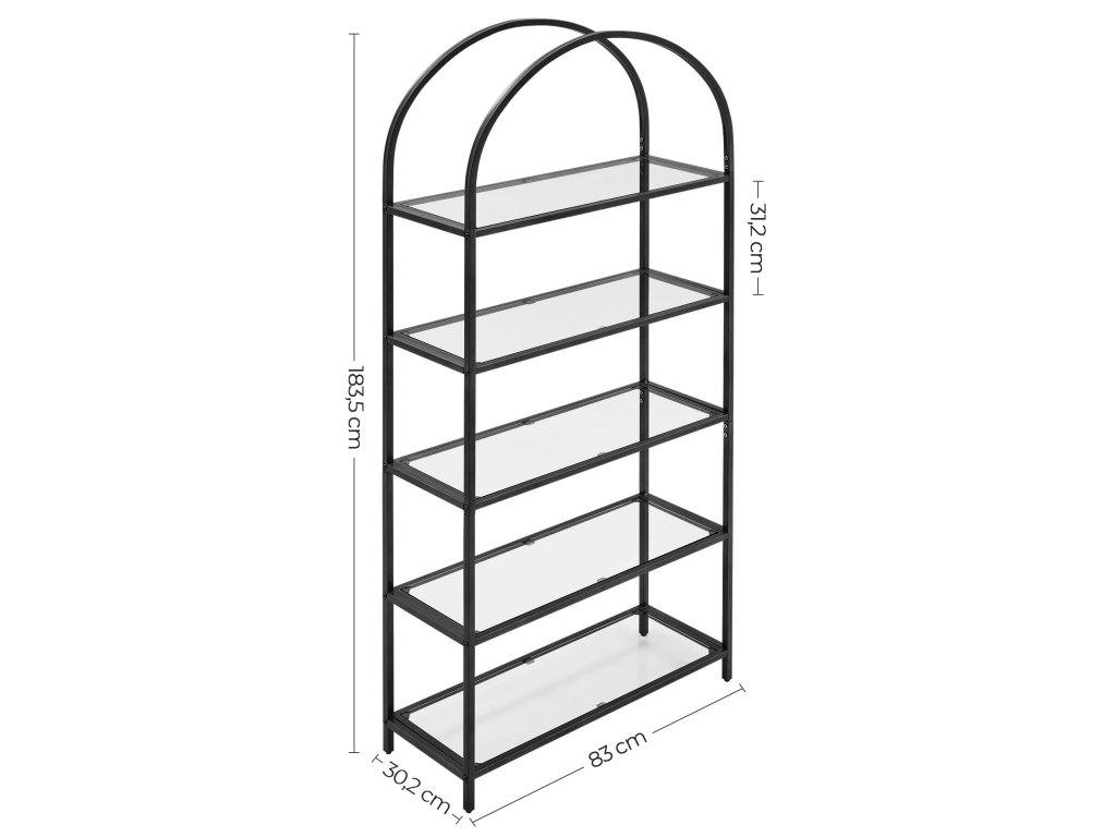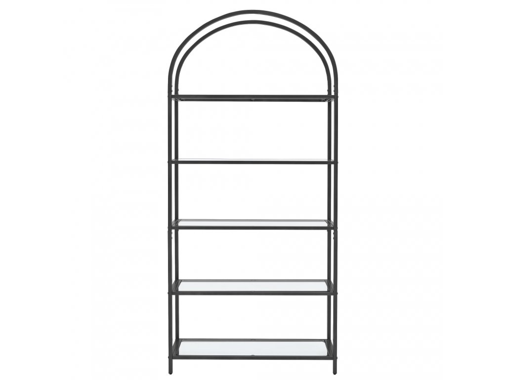 Regál na knihy vyrobený zo skla a ocele s čiernou práškovou povrchovou úpravou.