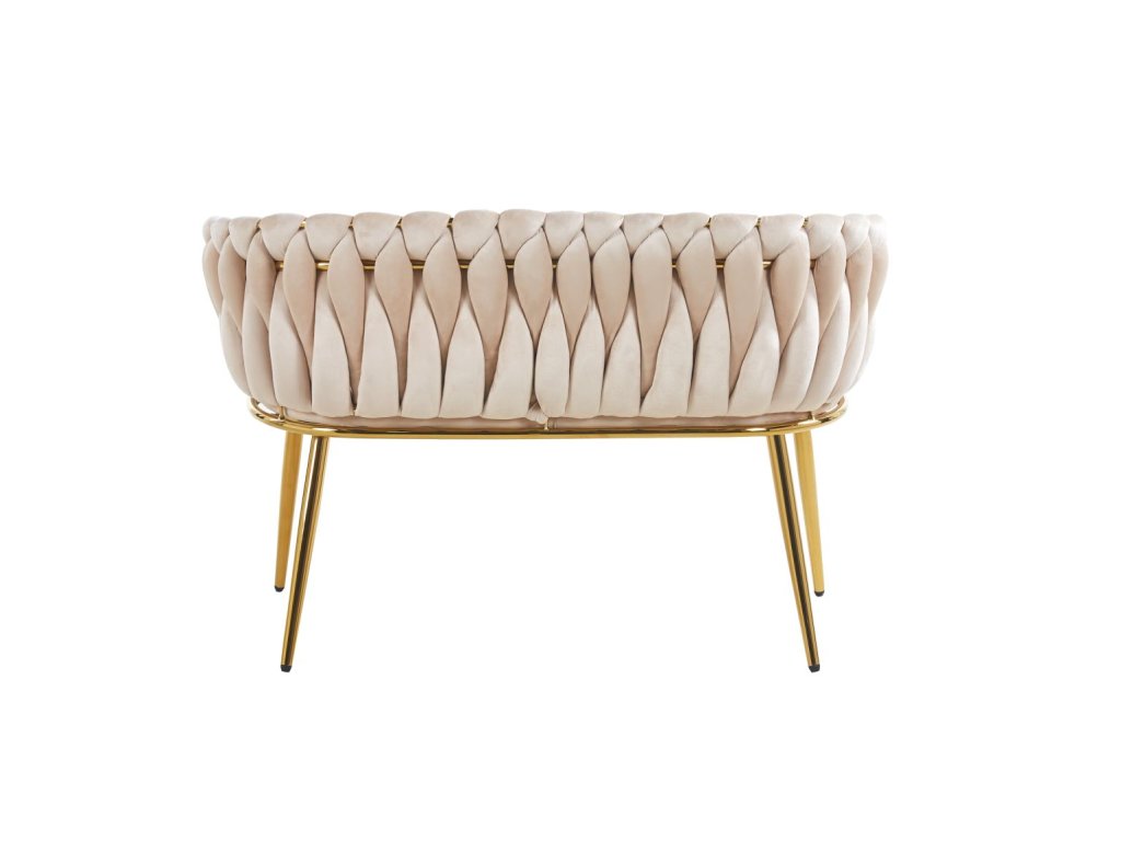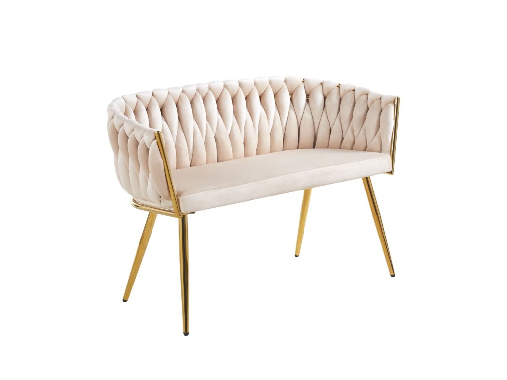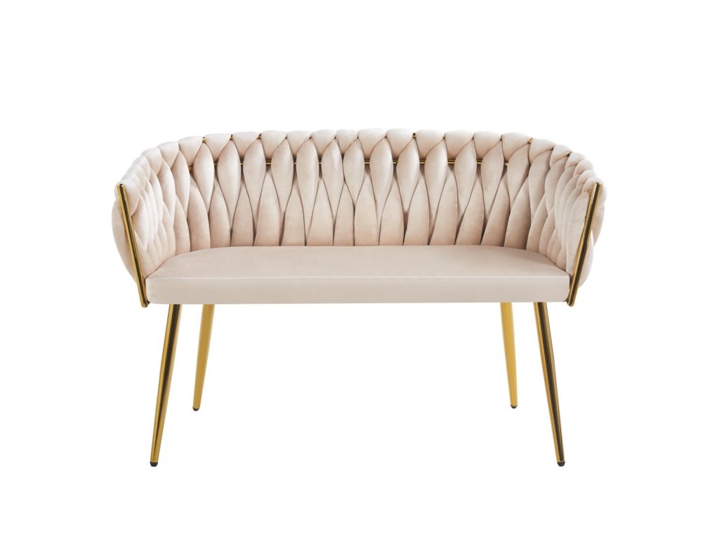 Táto velúrová pohovka/sedačka v béžovej farbe je výrazný solitér, ktorý pôsobí ako šperk v interiéri. Charakter jej dáva „pletené“ operadlo so zaobleným tvarom, ktoré vizuálne obopína sedenie a okamžite zjemní celý priestor. Kombinácia jemného velúru a zlatej kovovej konštrukcie vytvára elegantný, prémiový dojem — ideálny do interiérov, kde chcete pôsobiť upravene a reprezentatívne.
