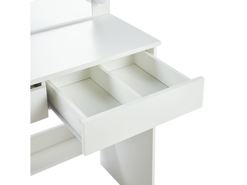 Kompaktné rozmery 80x40x140 cm robia zo stolíka univerzálne riešenie do menších aj väčších priestorov. Dve praktické zásuvky poskytujú dostatok úložného priestoru na kozmetiku, šperky a ďalšie potreby. Integrované LED podsvietenie zaisťuje rovnomerné osvetlenie tváre bez nepríjemných tieňov.