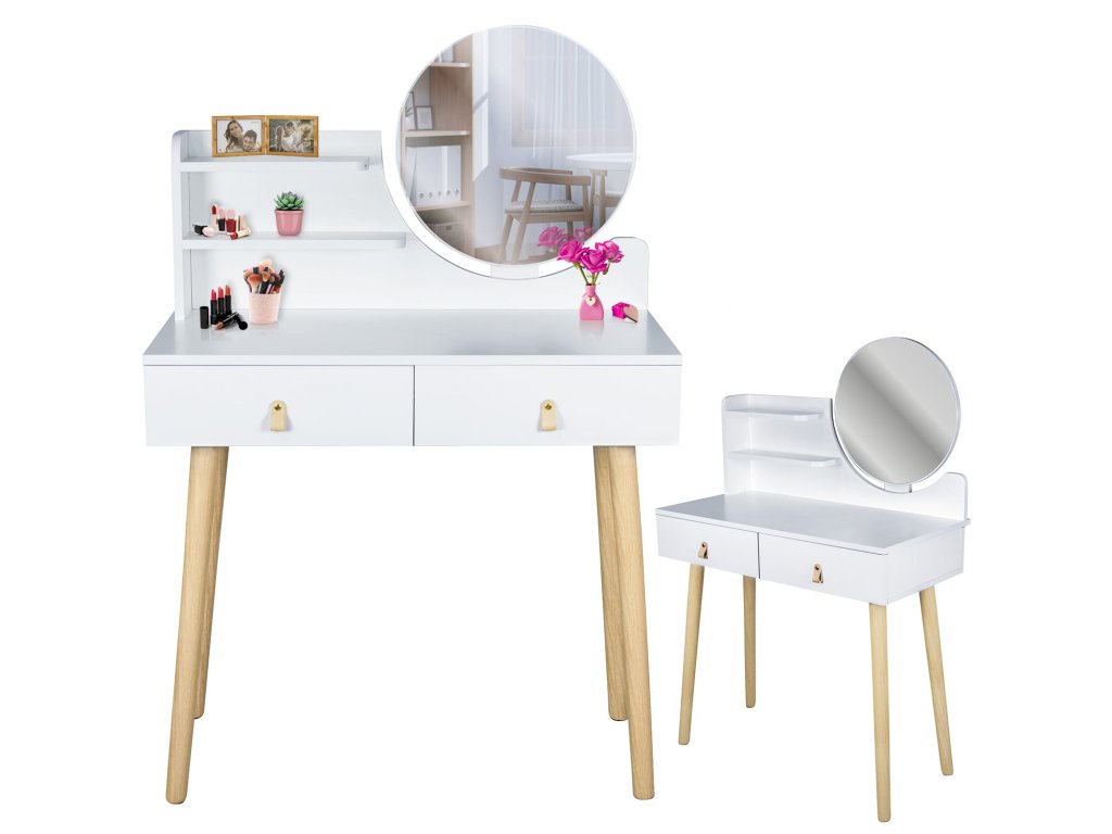 Moderný toaletný stolík s okrúhlym zrkadlom sa perfektne hodí do spálne ako praktické miesto na líčenie, úpravu vlasov, každodennú starostlivosť o krásu, ale aj na písanie listu či uloženie množstva rôznych drobností.