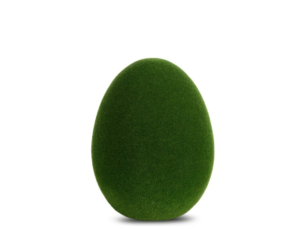 Očarujúca veľkonočná dekoračná figúrka v tvare vajíčka prinesie do vášho domova sviatočnú atmosféru a jarné čaro. Vyhotovená je z kvalitnej polyesterovej živice v nádhernej zelenej farbe s jemnou textúrou, ktorá pripomína prírodný mach alebo trávu.