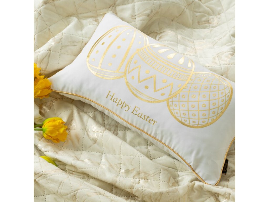Elegantná veľkonočná obliečka na vankúš z kvalitného polyesteru, zdobená zlatým nápisom ,, Happy Easter" a štylizovaným motívom veľkonočných vajíčok.