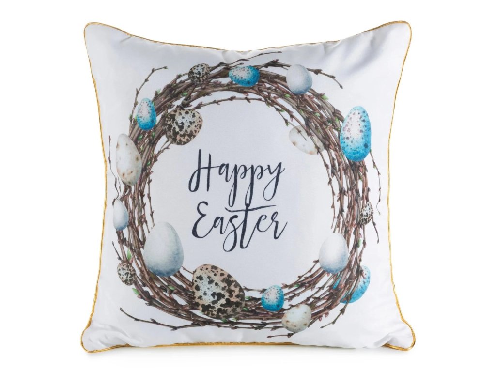 Elegantná veľkonočná obliečka na vankúš z kvalitného polyesteru, zdobená potlačou venca vytvoreného z bahniatok a veľkonočných vajíčok.