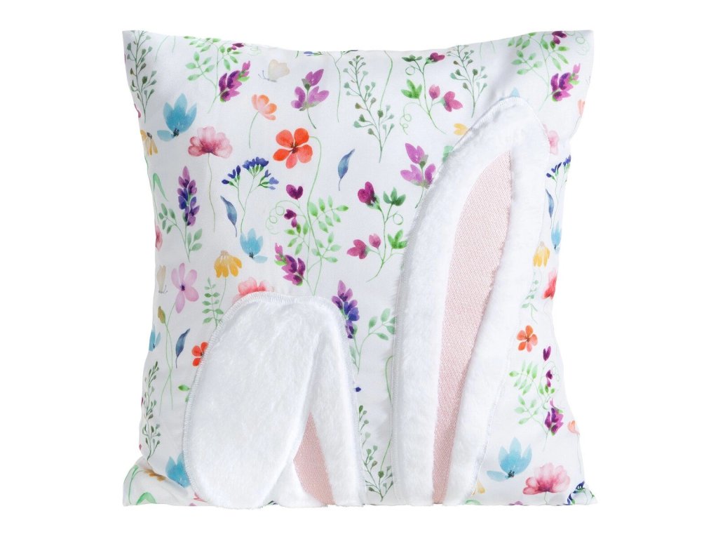 Elegantná veľkonočná obliečka na vankúš z kvalitného polyesteru, zdobená potlačou lúčnych kvetov a všitou aplikáciou zajačích uší.