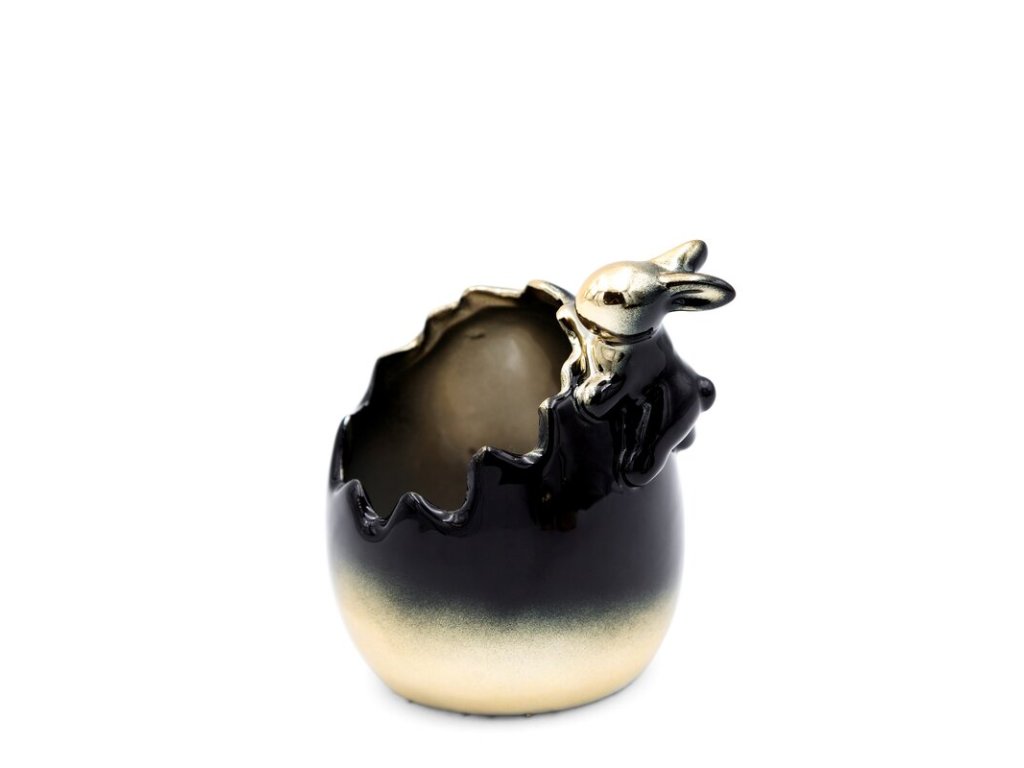 Táto decentná veľkonočná figúrka vajíčka so zajačikom predstavuje vrchol elegancie v menšom formáte. Je vyrobená z kvalitnej keramickej hliny a jej povrch zdobí trendové ombre v čiernej a zlatej farbe. Táto kombinácia pôsobí mimoriadne luxusne a do interiéru vnáša moderný vizuálny zážitok.