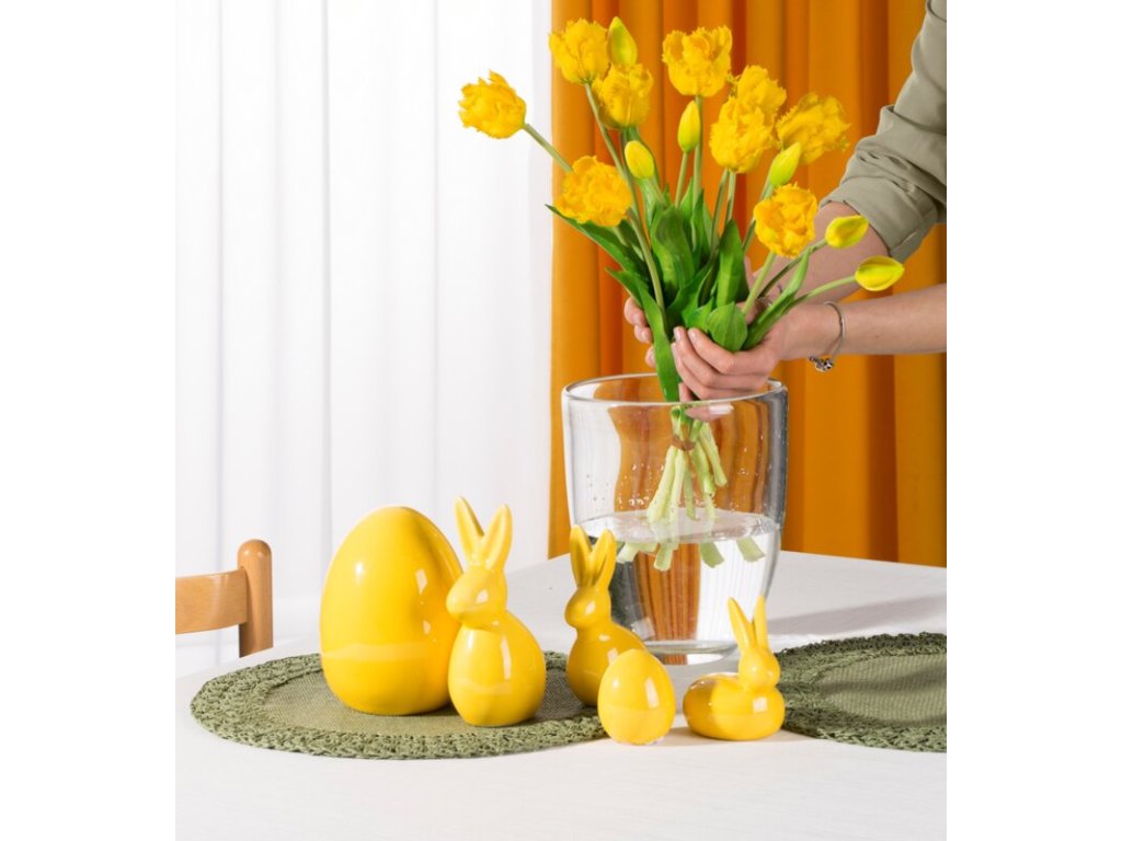 Dekorácia je vyrobená zo 100 % keramickej hliny, ktorá zaručuje pevnosť, stabilitu a kvalitné spracovanie. Lesklá žltá glazúra dodáva figúrke svieži vzhľad a krásne odráža svetlo. Žltá farba pôsobí prirodzene, harmonicky a ľahko sa kombinuje s ďalšími jarnými a veľkonočnými doplnkami.