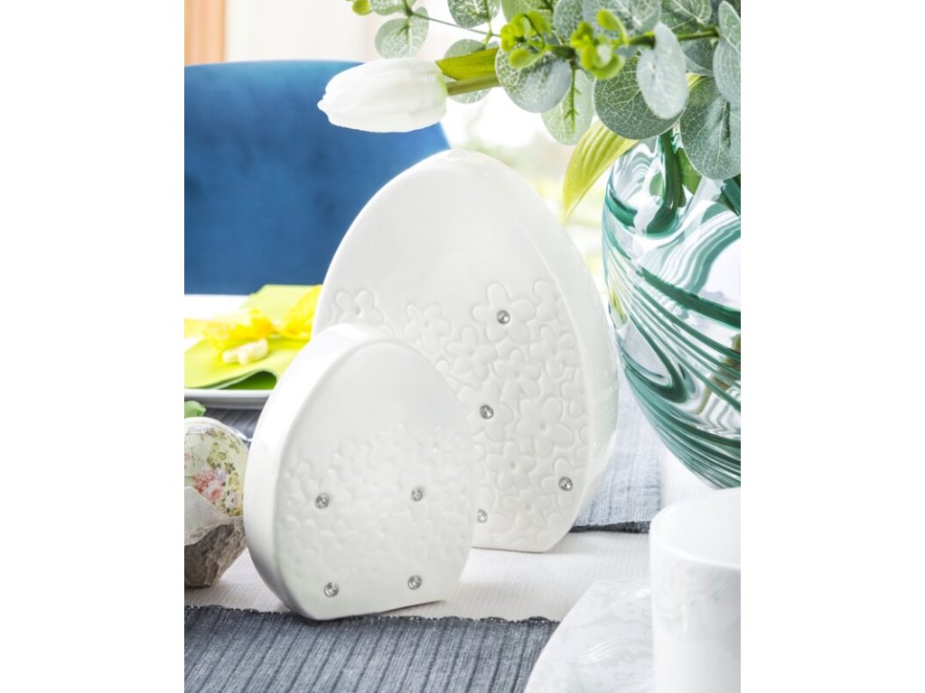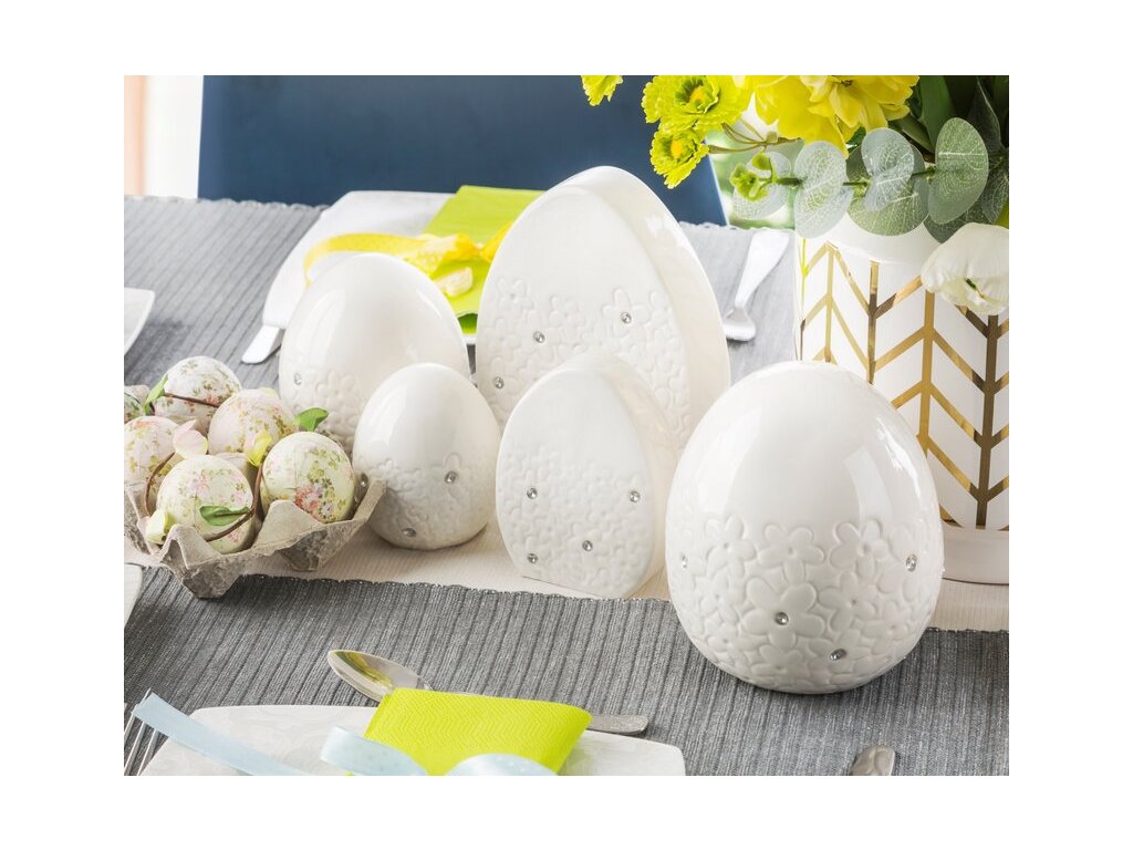 Štýlová a elegantná veľkonočná figúrka v tvare vajíčka vyrobená z kvalitnej keramickej hliny. Jej jedinečný dizajn podčiarkuje zdobenie v bielej farbe, ktoré dekorácii dodáva moderný a luxusný charakter.