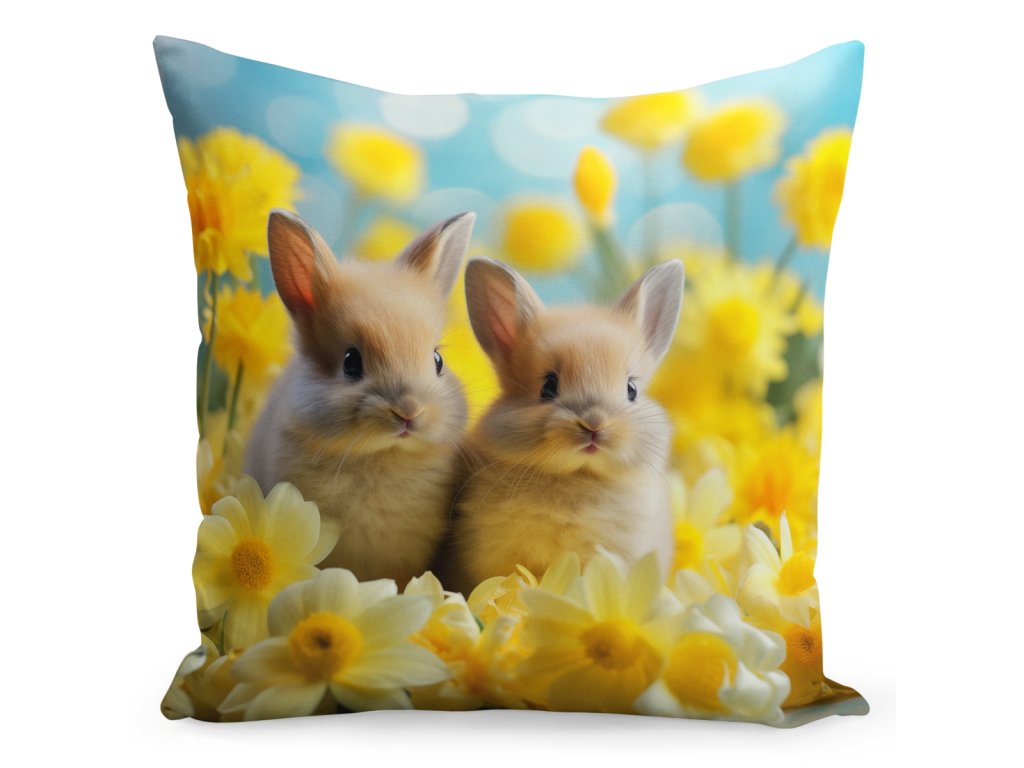 Táto obliečka na vankúš Vás zavedie do idylickej jarnej záhrady, kde sú dvaja zajačikovia obklopení žltými narcismi.