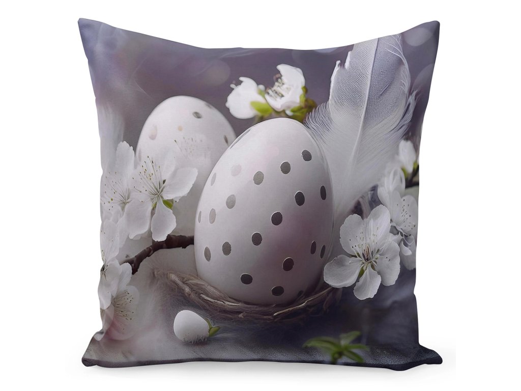 Motív bodkovaných veľkonočných vajíčok uložených v hniezde, doplnený bielymi jarnými kvetmi a jemným pierkom, pôsobí veľmi romanticky a pokojne.