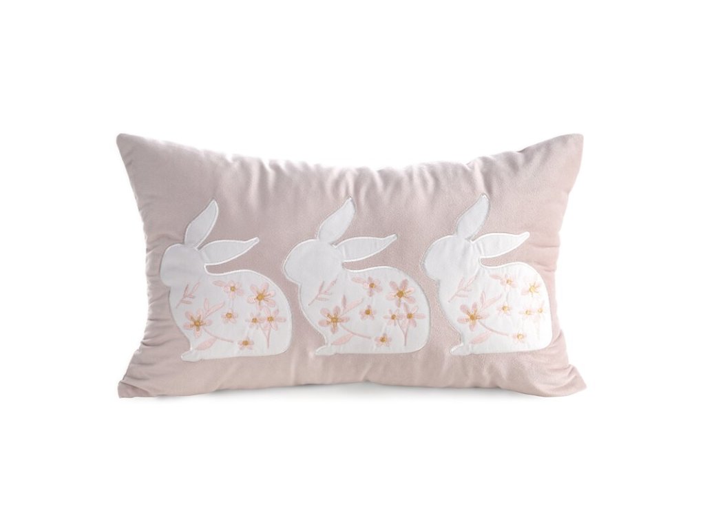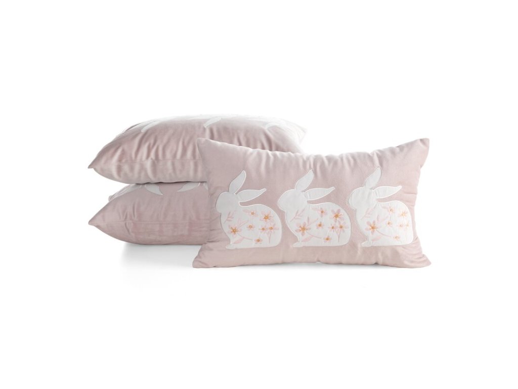 Jarná dekorácia, ktorá pôsobí jemne a zároveň štýlovo. Táto veľkonočná obliečka na vankúš v elegantnom svetloružovom odtieni je zdobená motívom troch zajačikov s kvetinovým detailom, vďaka čomu vytvorí na pohovke či posteli harmonický, sviatočný akcent. Predĺžený rozmer 30 × 50 cm je ideálny na doladenie aranžmánu – krásne vyplní priestor medzi väčšími vankúšmi a dodá interiéru „hotelový“ vzhľad bez prehnanej dekoratívnosti.