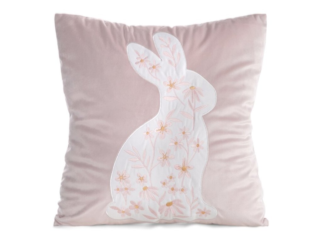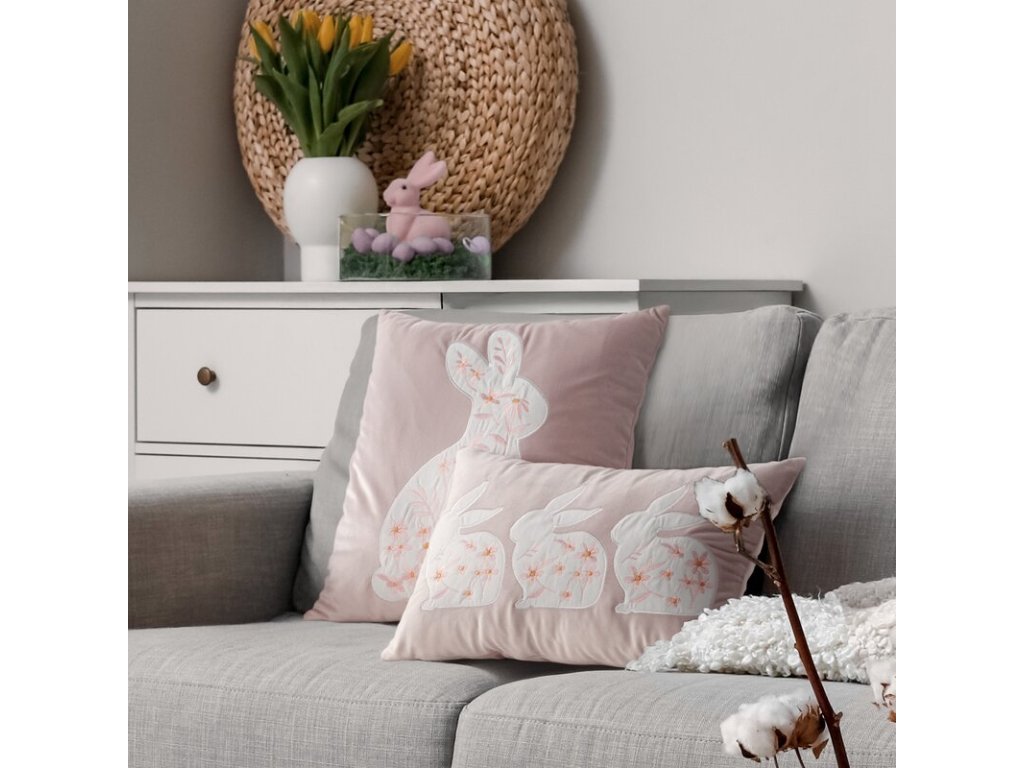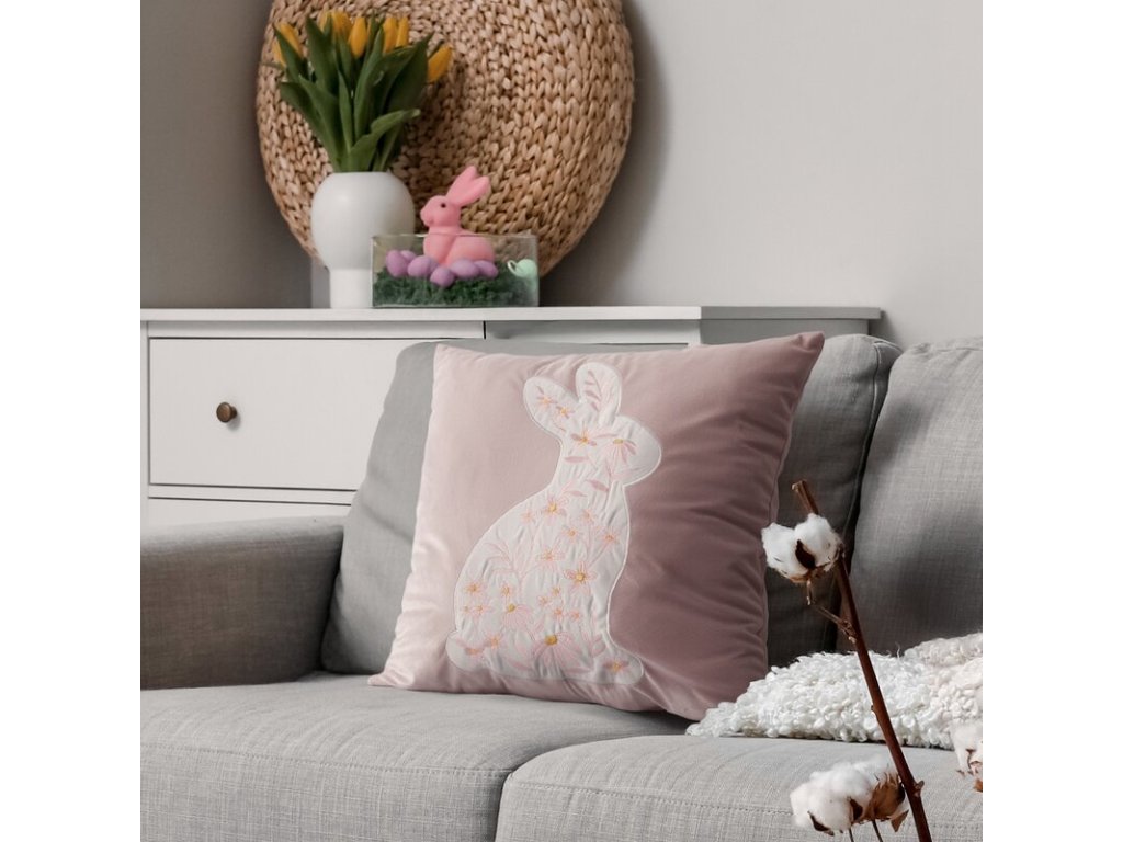 Jemná, elegantná a dokonale jarná. Táto veľkonočná obliečka na vankúš v svetloružovom odtieni zaujme nežným motívom zajačika s kvetinovým dekorom, ktorý pôsobí romanticky, no stále vkusne a luxusne. Vďaka čistým líniám a decentným farbám sa hodí ako sviatočný akcent na sedačku, kreslo aj posteľ – bez toho, aby interiér pôsobil prezdobený.