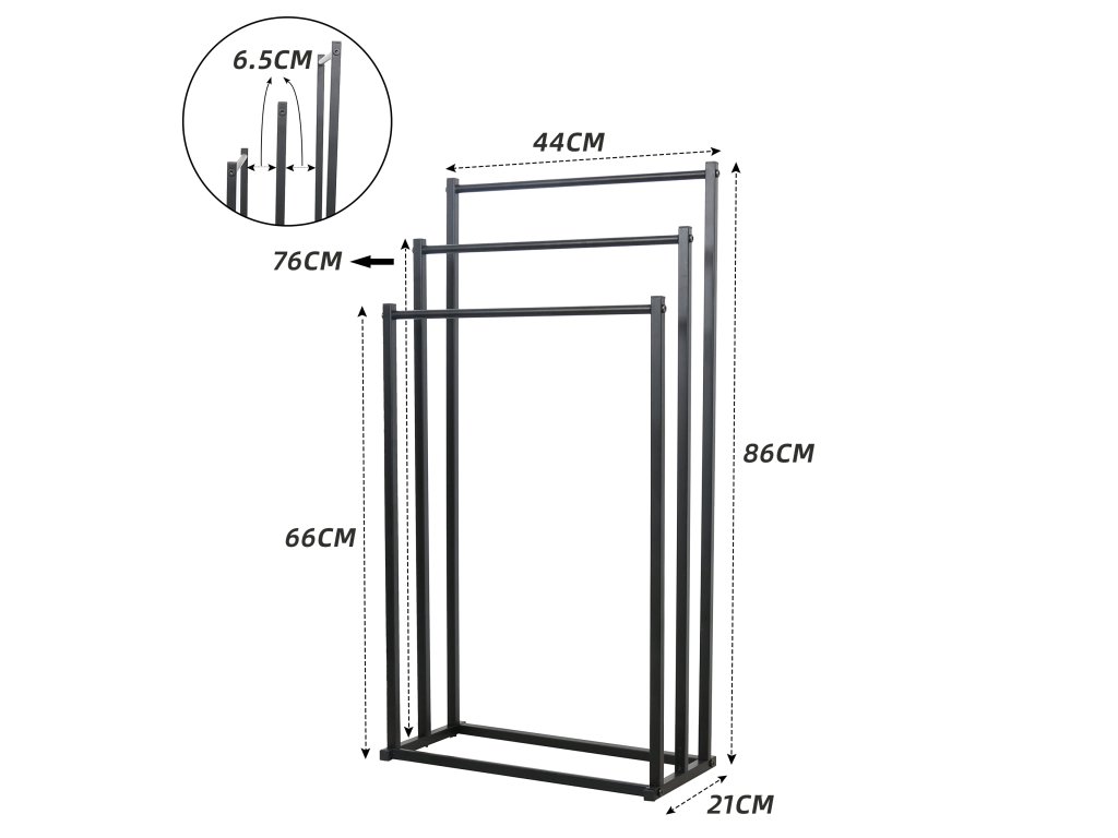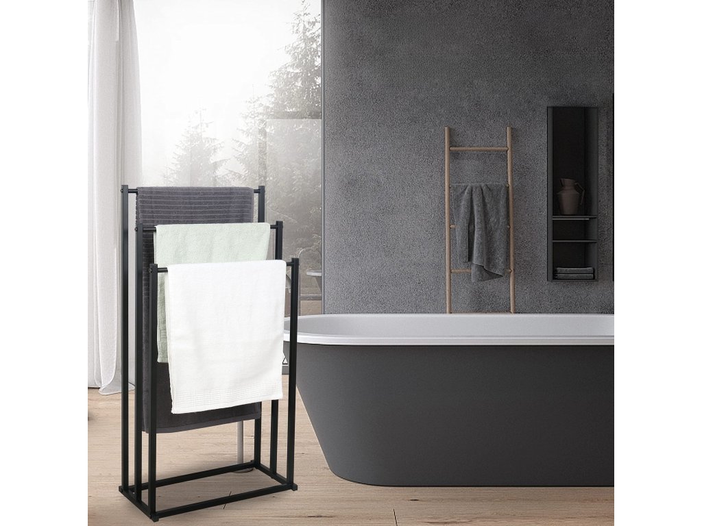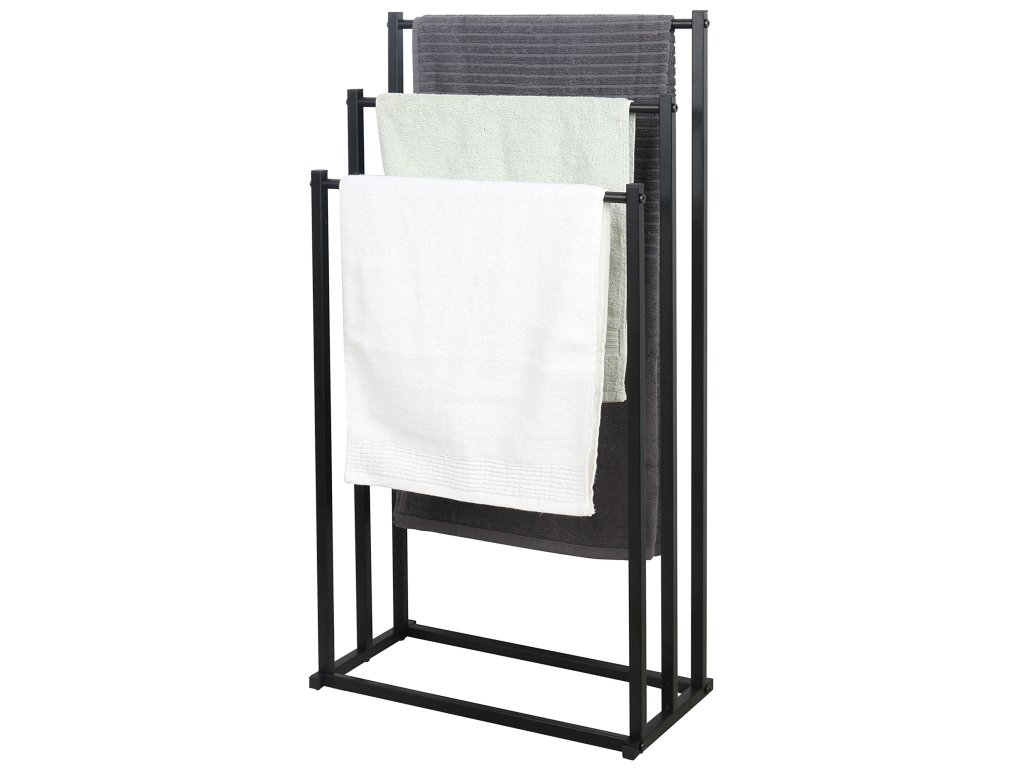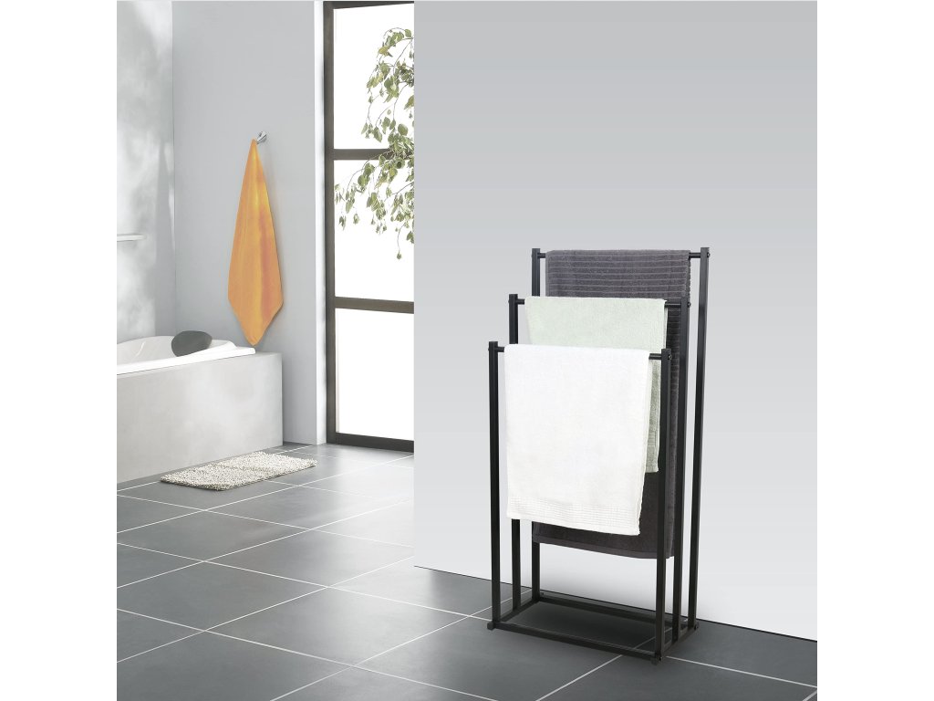 Minimalistický dizajn v čiernej farbe pôsobí moderne a nadčasovo, vďaka čomu sa vešiak jednoducho prispôsobí rôznym štýlom kúpeľní – od moderných až po industriálne. Okrem uterákov ho využijete aj na sušenie plaviek, županov či drobnej bielizne.