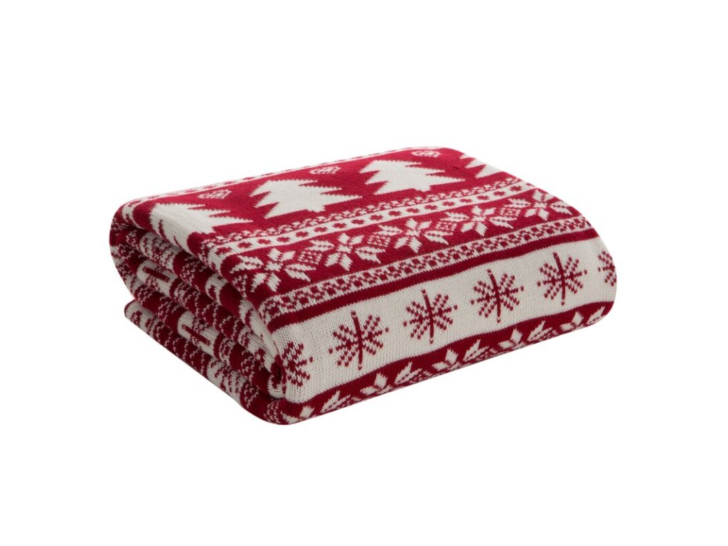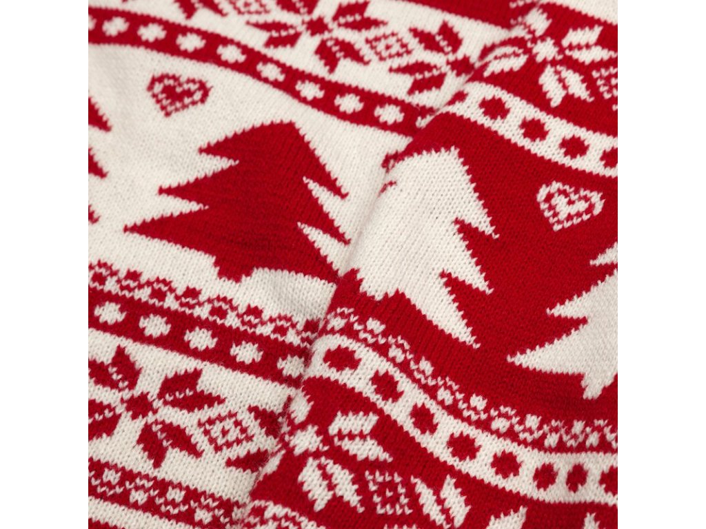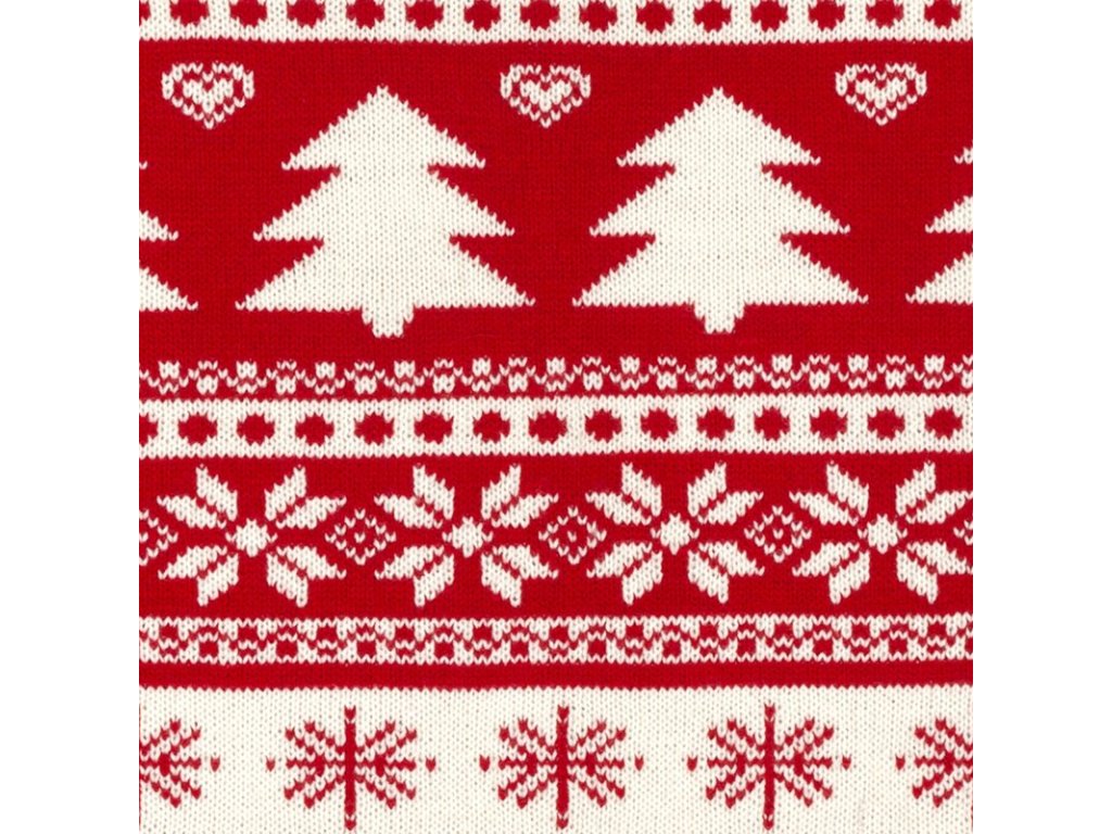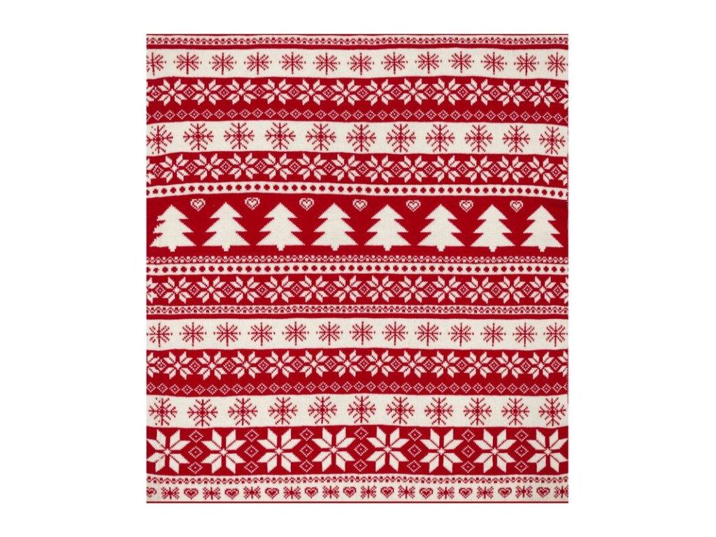Deka je zdobená pôvabnými škandinávskymi motívmi ako sú vianočné stromčeky, hviezdičky, srdiečka v kontrastnej bielej a červenej farbe.