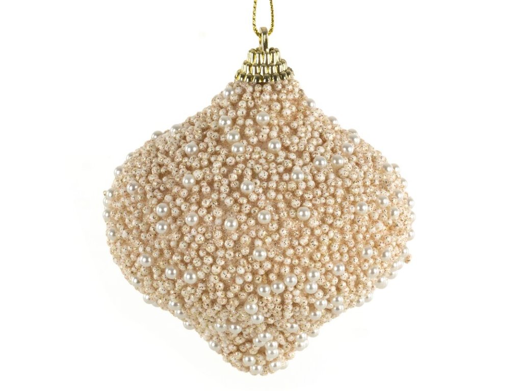 Ozdoba na vianočný stromček je vyrobená z plastu a pokrytá malými guľôčkami v kombinácií s malinkými perličkami.