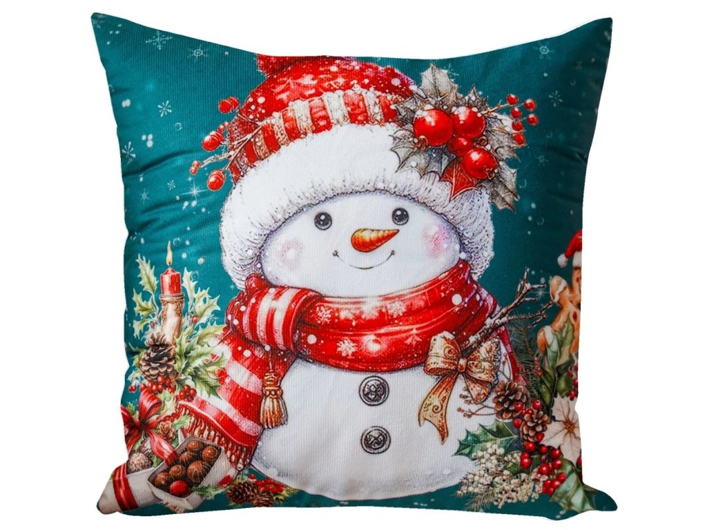 Sviatočná, velúrová obliečka na vankúš s jemnou zamatovou textúrou s veselým snehuliakom v červenej čiapke a šále na pozadí sýtej zelenej farby.