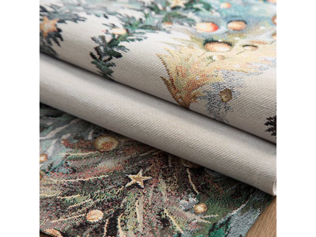Vneste do svojho domova kúzlo Vianoc s gobelínovým obrusom LES, ktorý zaujme nádherným motívom zasnežených vianočných stromčekov ozdobených zlatými guľami a hviezdami.
