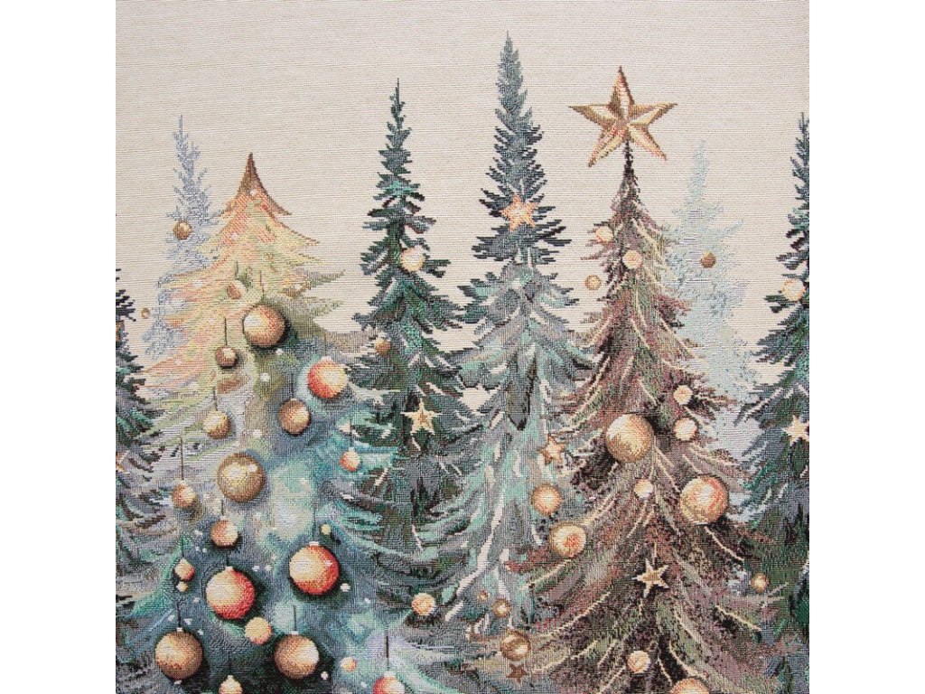 Vneste do svojho domova kúzlo Vianoc s gobelínovým obrusom LES, ktorý zaujme nádherným motívom zasnežených vianočných stromčekov ozdobených zlatými guľami a hviezdami.
