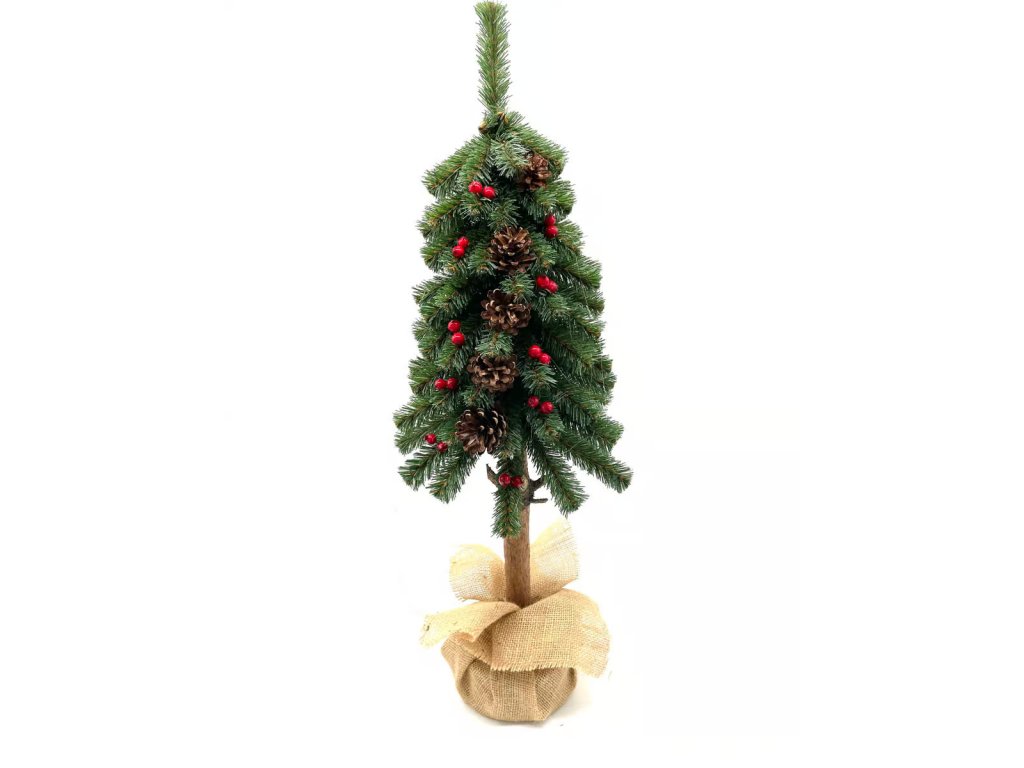 Zelený stromček dozdobený prírodnými ozdobami evokuje zimné rozprávkové scenérie.