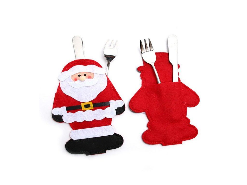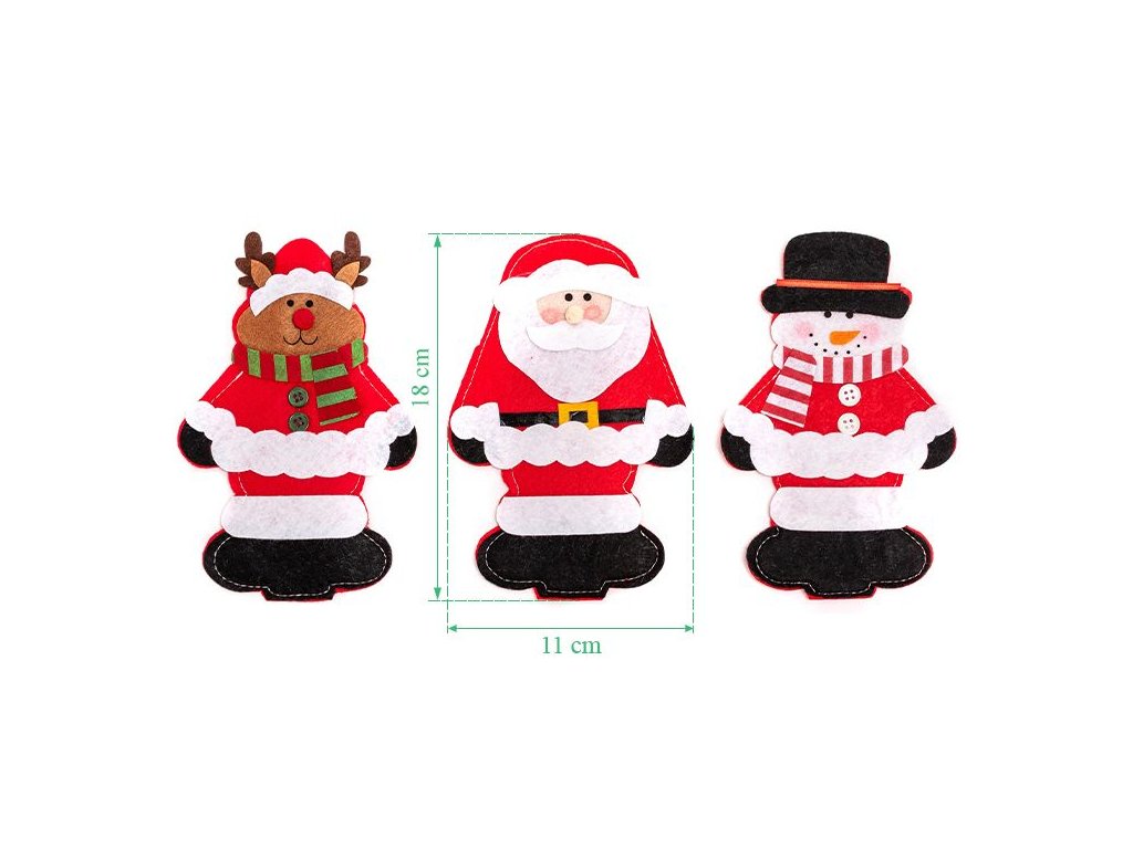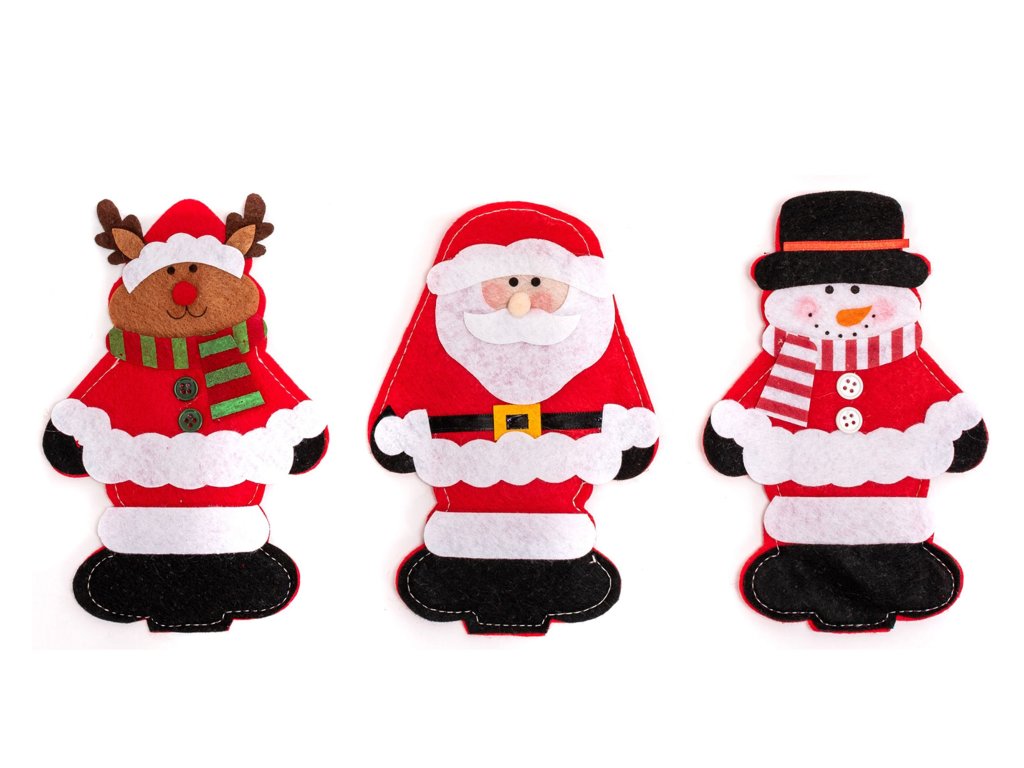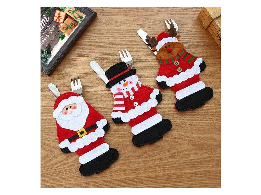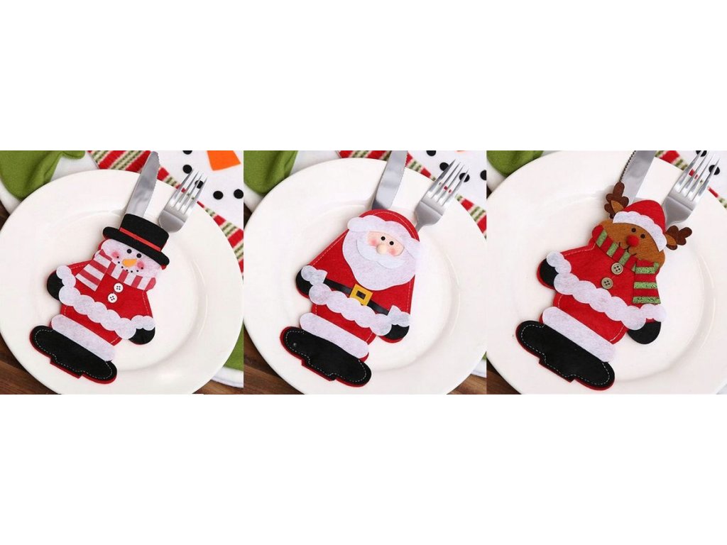 Krásne červené obaly na príbory s motívmi soba, Mikuláša a snehuliaka.