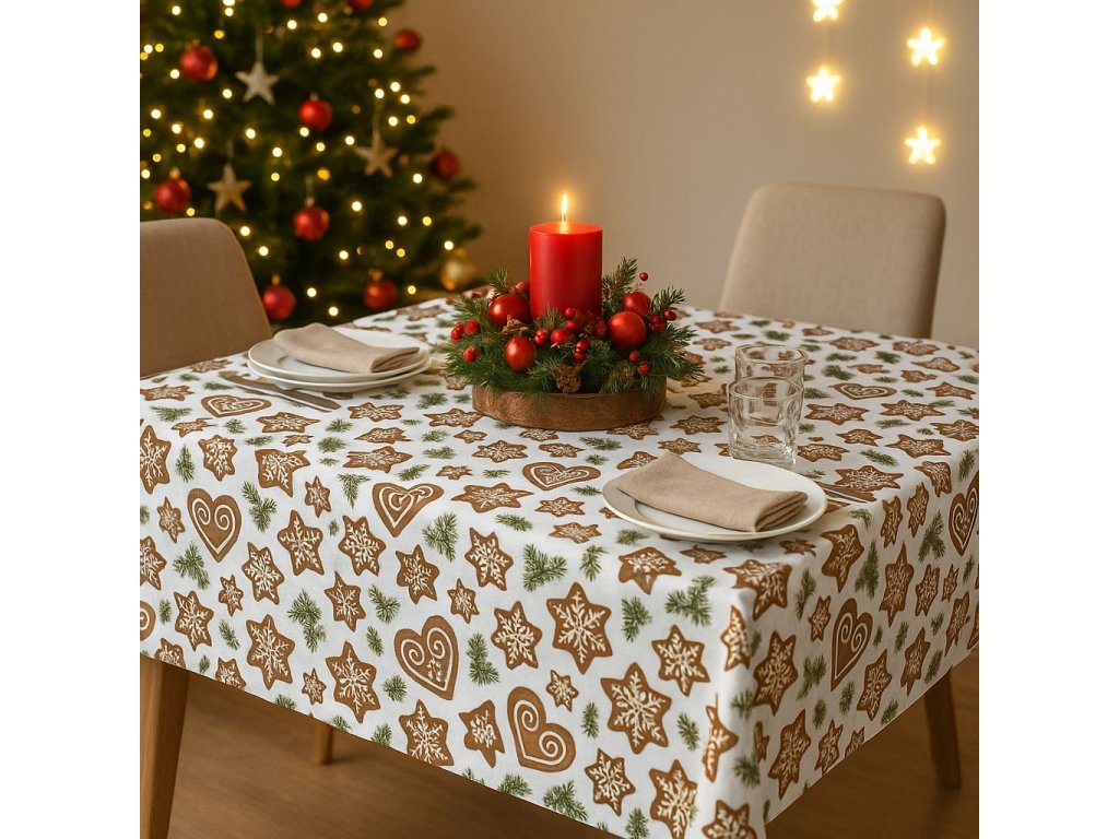 Vneste do svojho domova pravú sviatočnú atmosféru s týmto očarujúcim vianočným obrusom s motívom medovníčkov a ihličia.