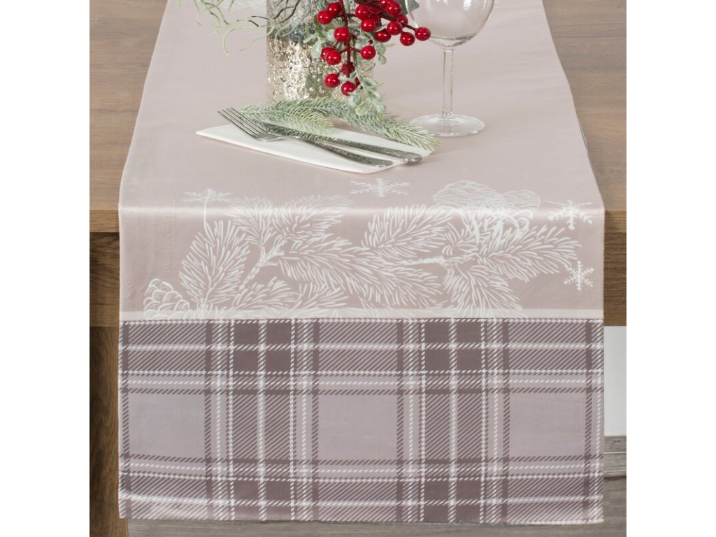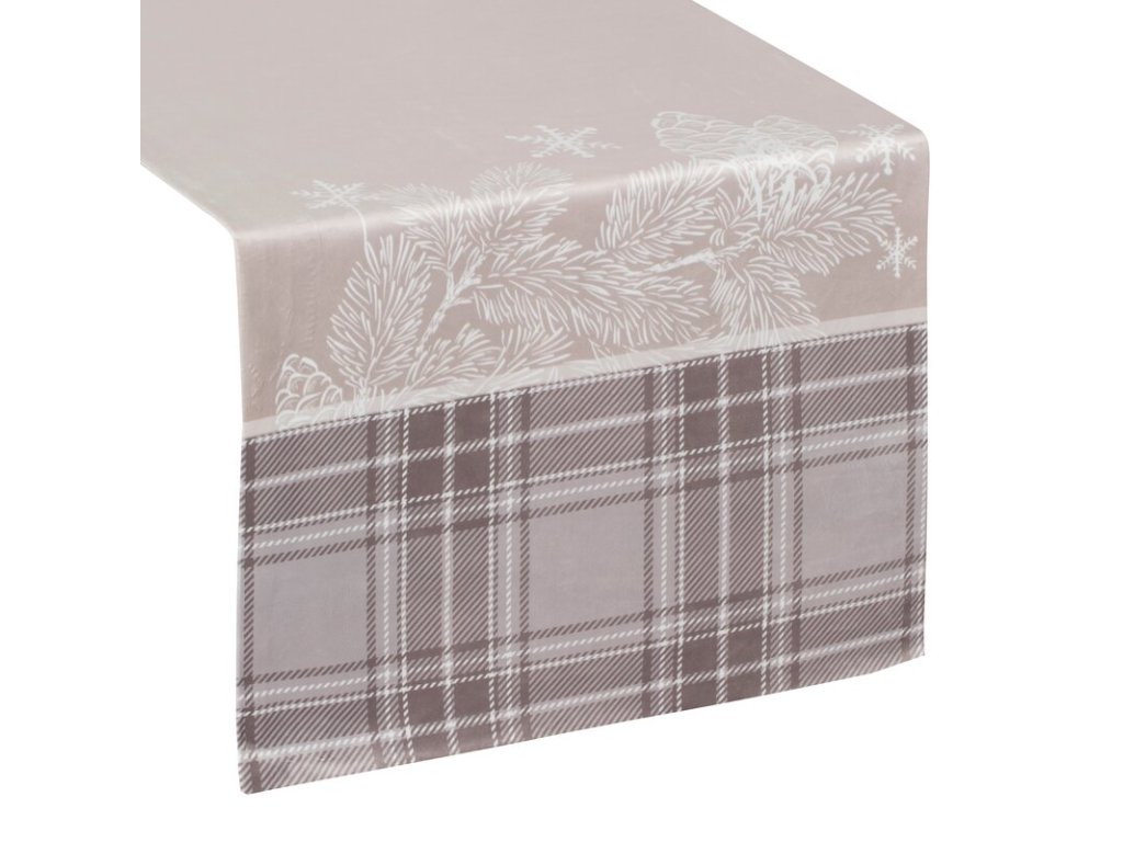 Zamatový dekoračný behúň na stôl s vianočným motívom v béžovej farbe.