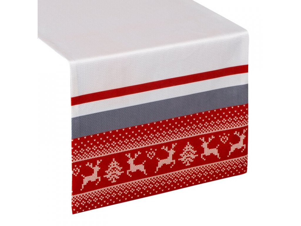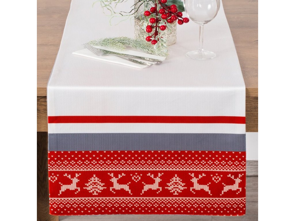 Zamatový dekoračný behúň na stôl s vianočným motívom v bielej farbe s červeným a sivým vzorom.