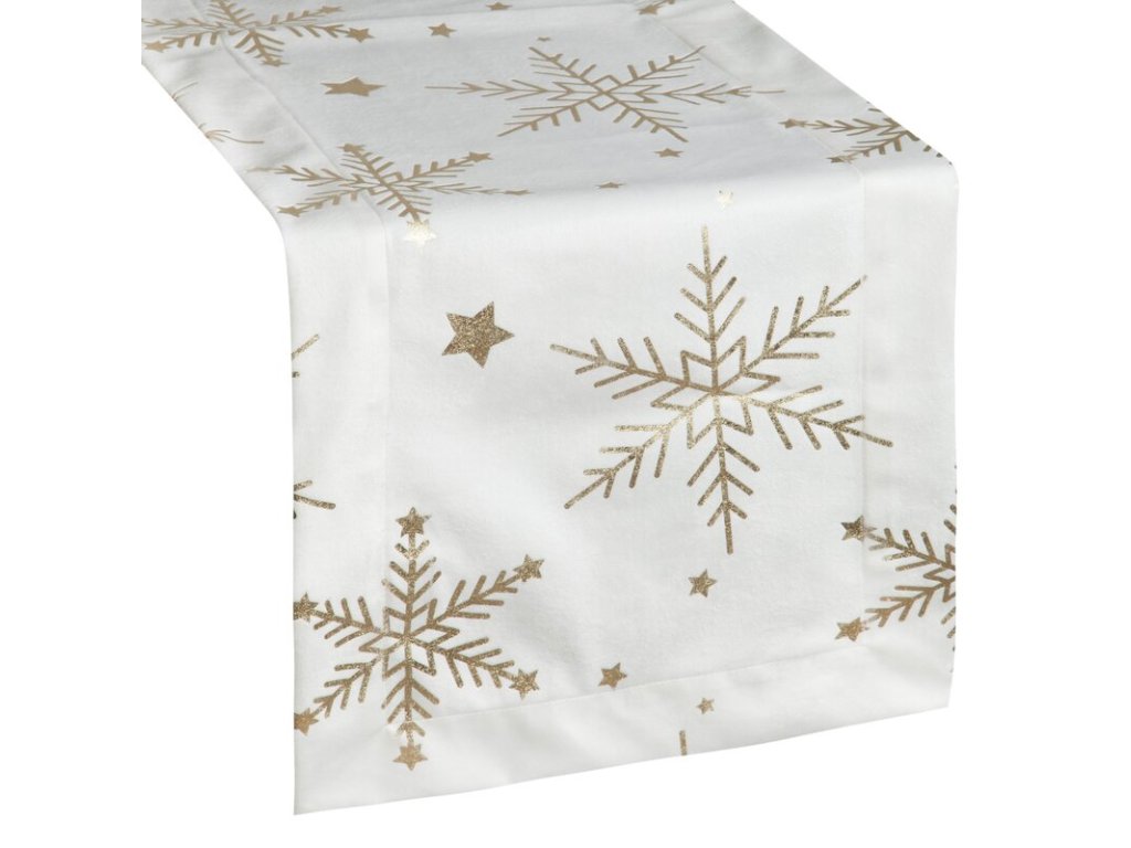 Vianočný zamatový behúň na stôl v bielej farbe so zlatými vločkami 40 x 140 cm